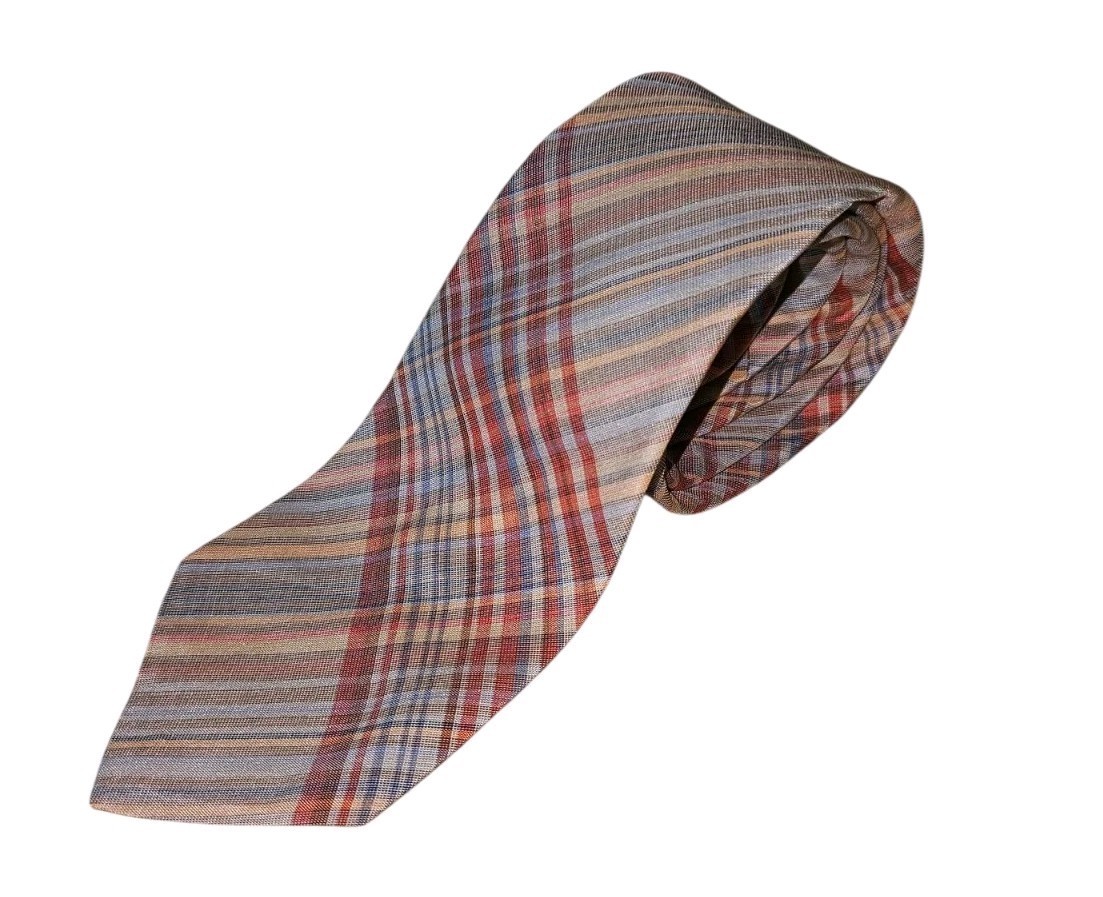 This product is a vintage Yves Saint Laurent necktie from the 1980s, made from 100% silk and woven in France. The tie features a plaid pattern in pastel colors, with the iconic YSL logo present as a detail. With a short length of 54 inches and a width of 4 inches, this tie is perfect for business occasions, offering a professional and sophisticated look. This original YSL tie is a unique and high-quality addition to any man's wardrobe, showcasing the luxury and style that Yves Saint Laurent is known for.