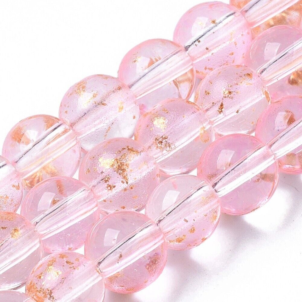 - Z Lot of 5 strands Painted Glass Beads Round pink Camellia gold foil 6mm HP7