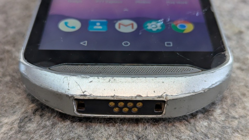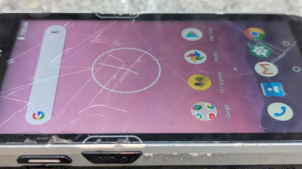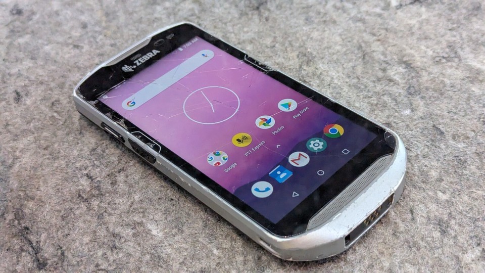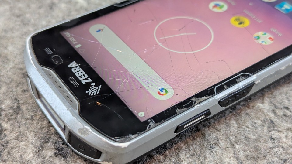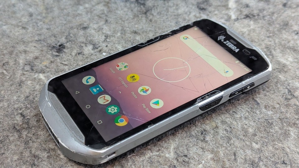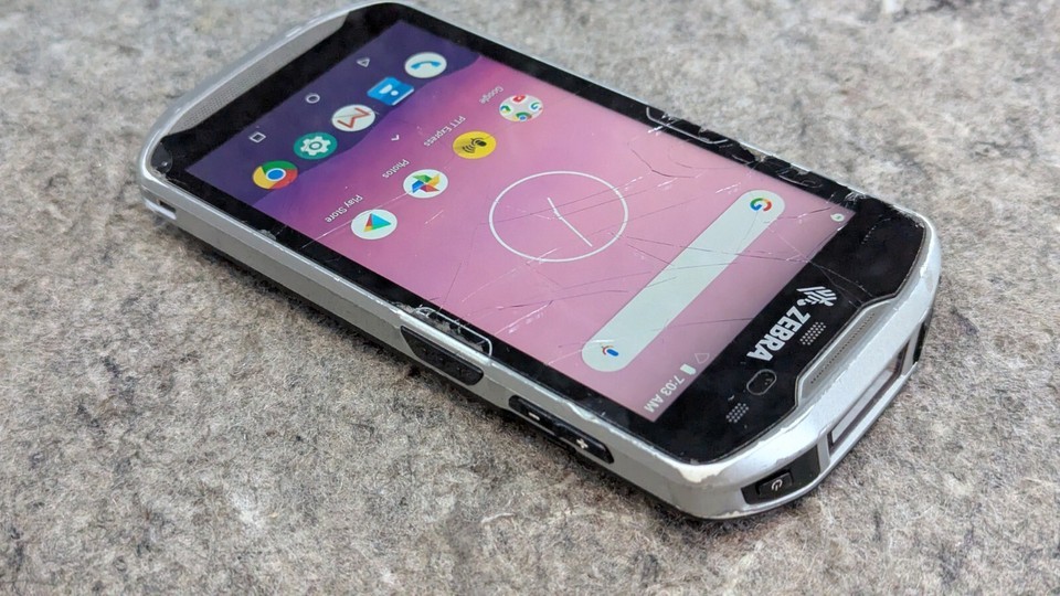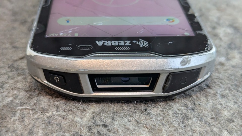 Cleaned and disinfected. Has been factory reset, tested and works great with no issues. Usage wear, cracked screen on the sides and missing the back base cover as shown in the pictures. Nothing that affects its functionality. Only the scanner is included. No battery.