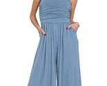 This elegant strapless culotte jumpsuit features a sophisticated bandeau top with delicate ruching across the bodice, creating a flattering silhouette. Crafted from soft, lightweight jersey fabric in a beautiful heathered blue shade, it offers both comfort and style. The wide-leg culotte design provides ease of movement while maintaining a polished look. Practical side pockets add functionality, and the elastic waistband ensures a comfortable fit. Perfect for casual outings, beach vacations, or dressed up for evening events. The breathable material makes it ideal for warm weather wear.