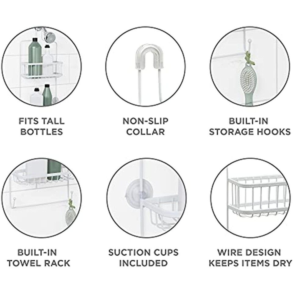 ADDS MORE STORAGE TO YOUR SHOWER: Includes 2 wire storage baskets, a washcloth bar and hooks for hanging shower poufs and more
