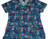Zoe + Chloe Scrubs Shirt Teal Green Blue Feathers Geometric Small Nurse Vet