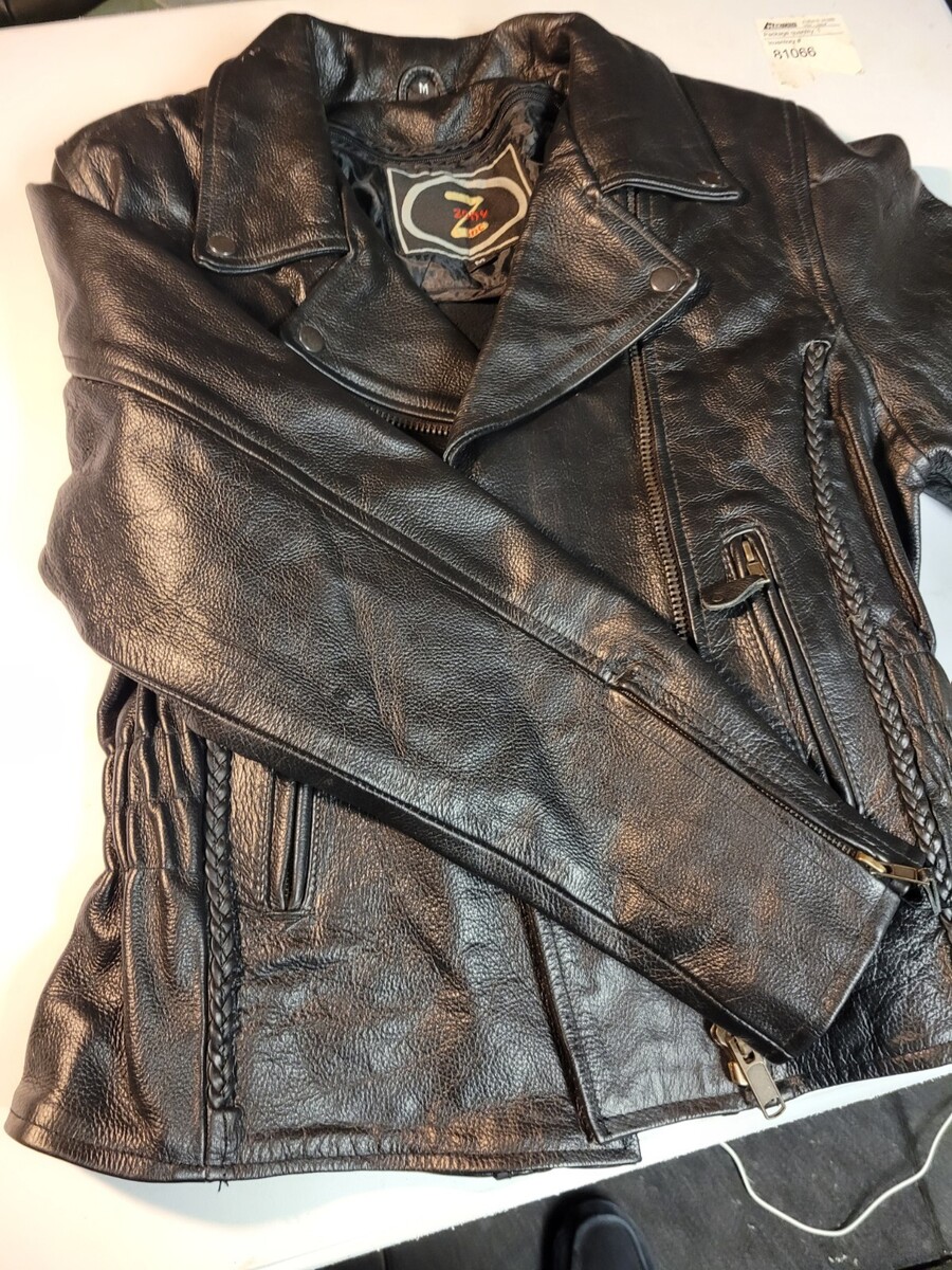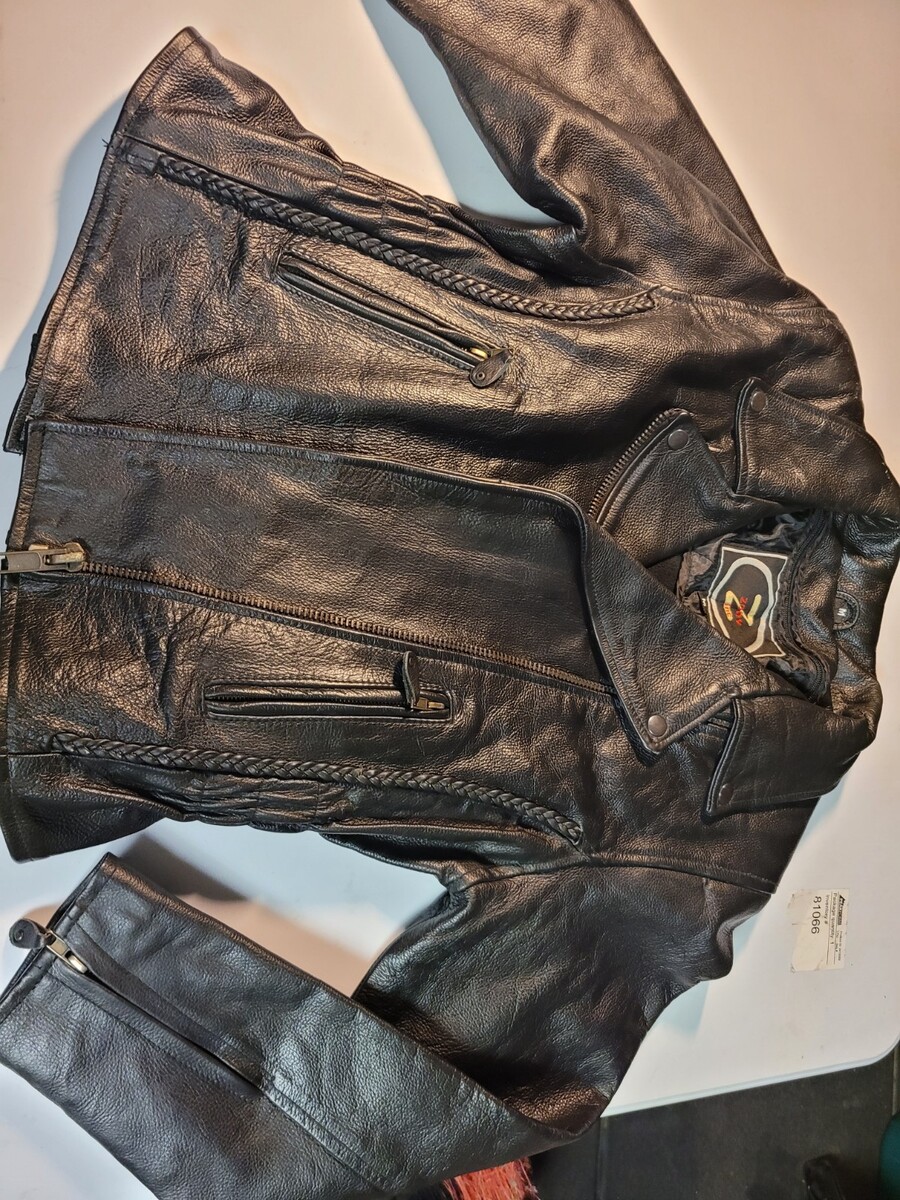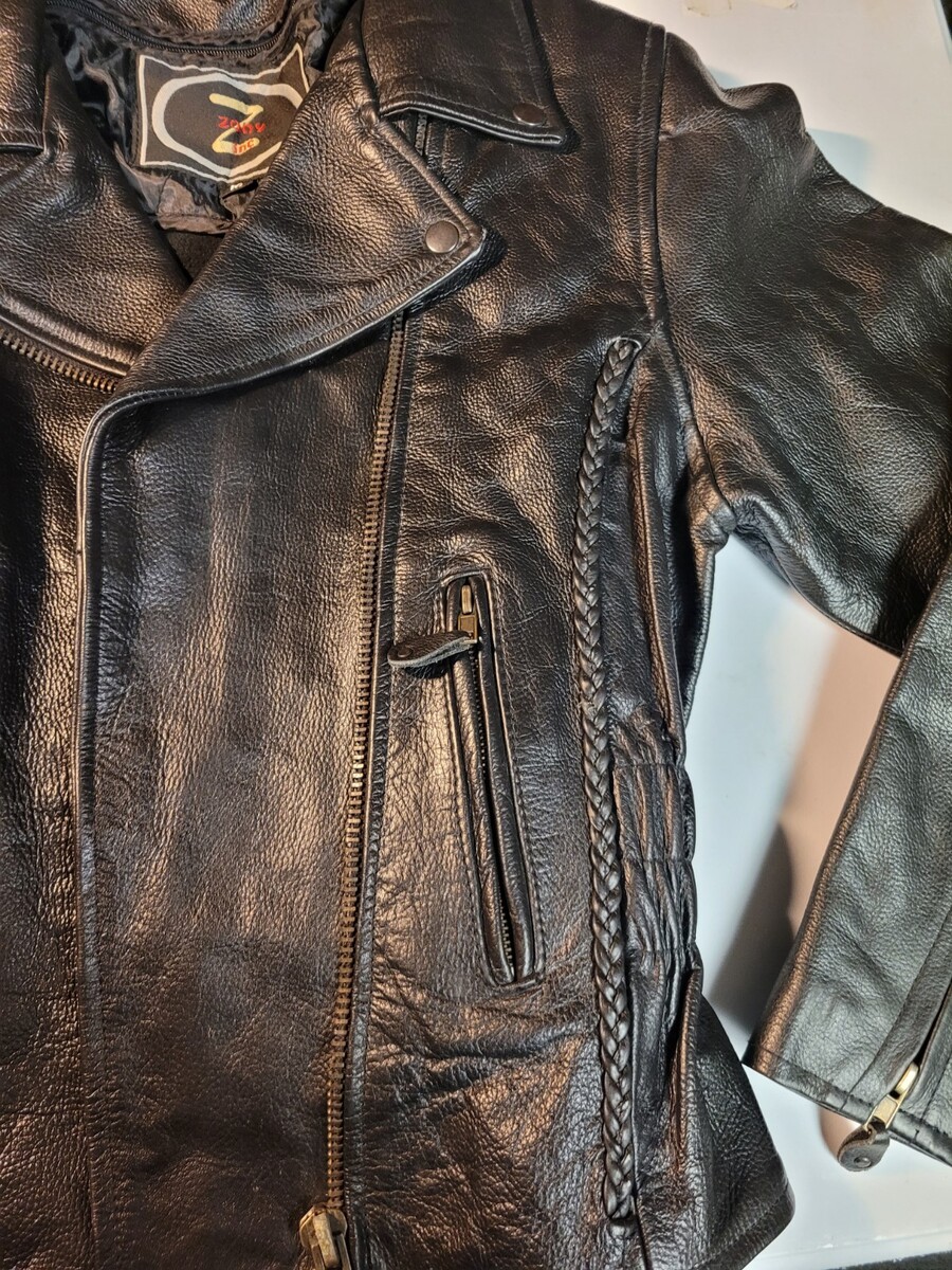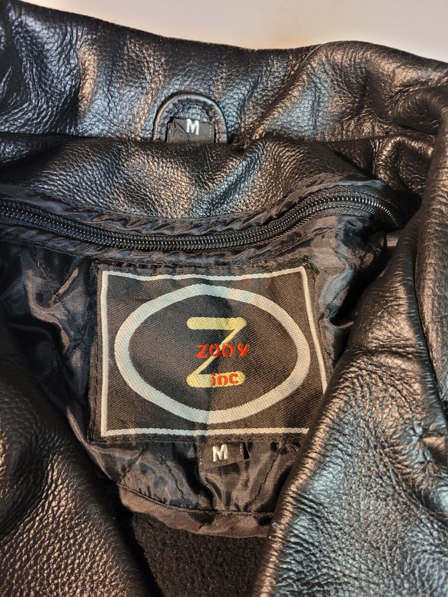 Vintage Zony Inc Black Leather Biker Motorcycle Riding Jacket with Zip Out removeable Lining Women's size M on size tag. See all measurements. Stretchy waist for comfort and fit. Stud accents on back of waist. Leather braid accent details. Zip pockets. Cuffs zipper.