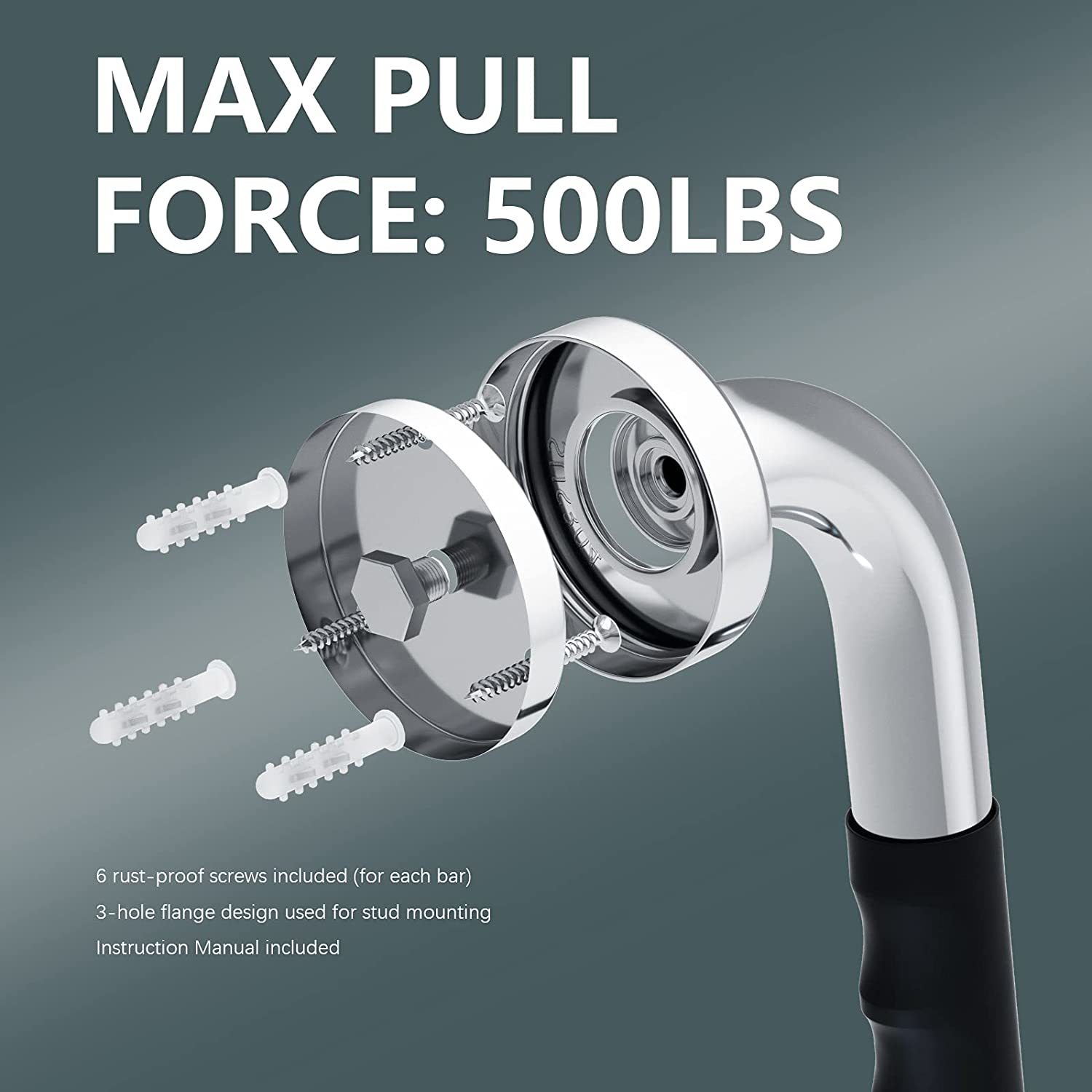 Measuring 16 inch in length, 1.0 inch diameter SUS304 stainless steel shower grab bar with non-slip soft rubber grip in the surface middle is fully ADA compliant and rated for supporting up to 500 pounds pull force. Accidents can occur, but be ready before they happen.