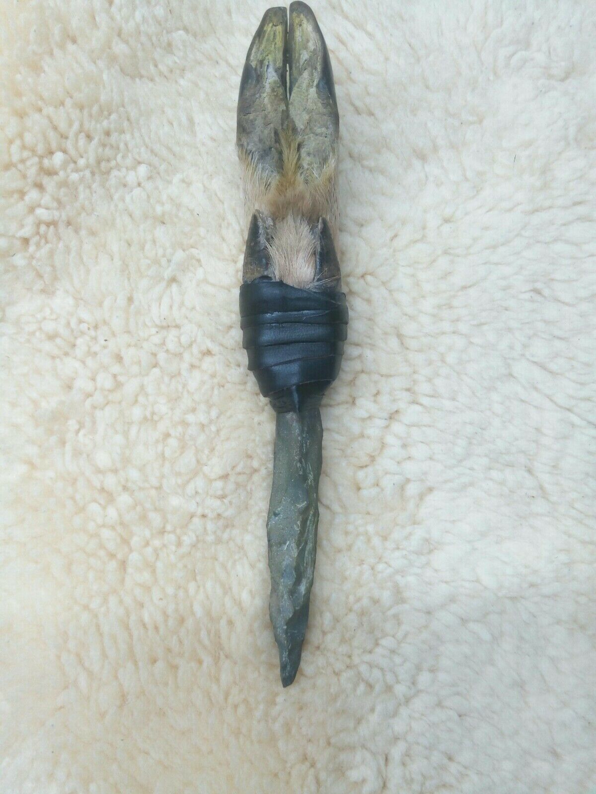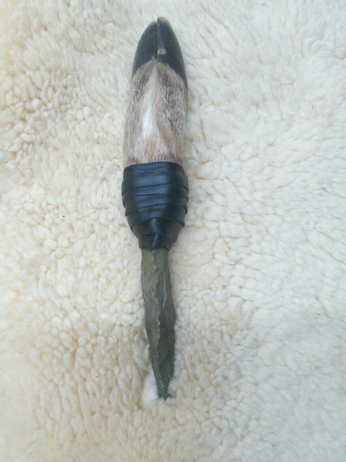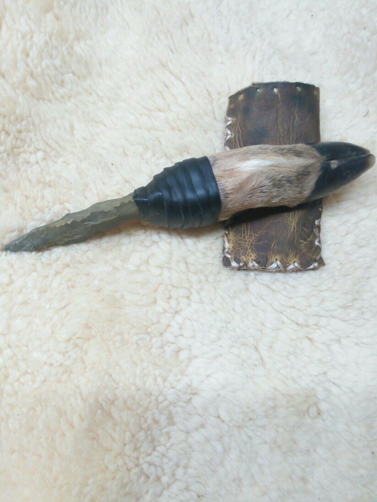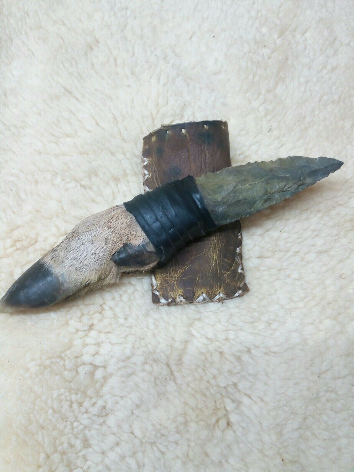 agate knife mounted in deer hoof, raw hide sheath. hand napped agate stone ( a green color) mounted in a natural deer hoof. wrapped in black deer buckskin. hand stitched raw hide sheath. unique knife. beautifully made. powwow reenactors black powder. Condition is "New". Shipped with USPS First Class.