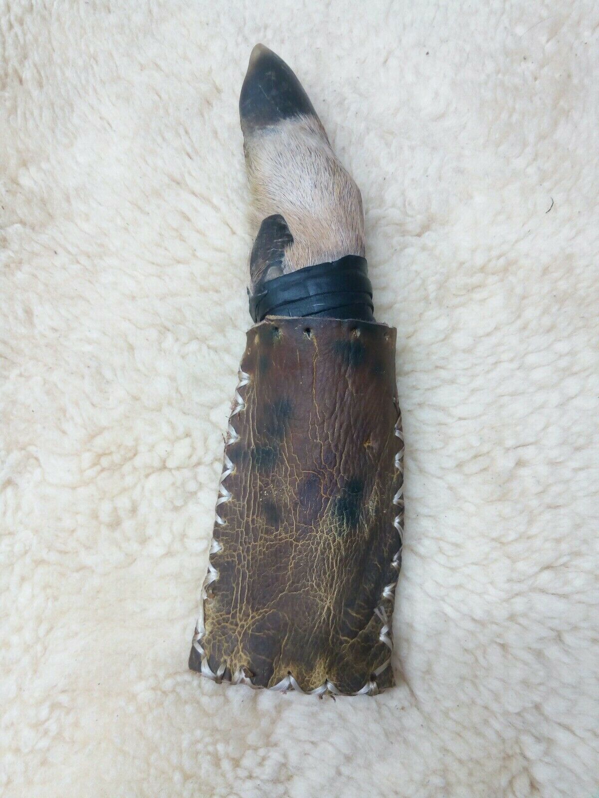 - agate knife mounted in deer hoof raw hide sheath powwow reenactors