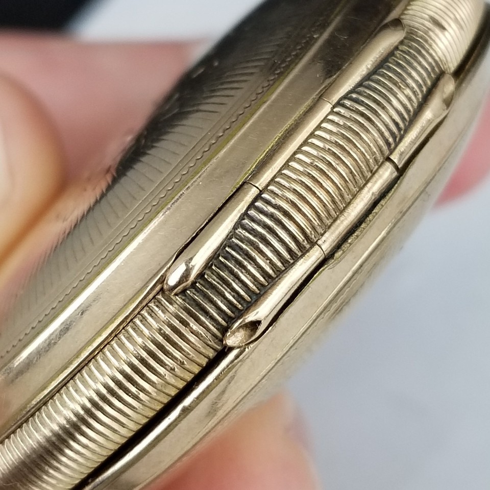 CASE CONDITION: The glass crystal is good with no scratches, cracks, or scuffs. Light signs of age only on the case...couple small dings on one side. All covers open and close as they should. IT IS BEAUTIFULLY ENGRAVED ON BOTH THE FRONT AND BACK. No initials have been engraved on the case. The loop on the top rotates perfectly.