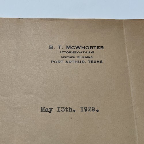antique letter Port Arthur TX B. T. McWhorter to State Rep. B. E. Quinn 1929