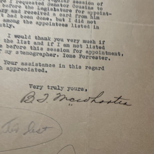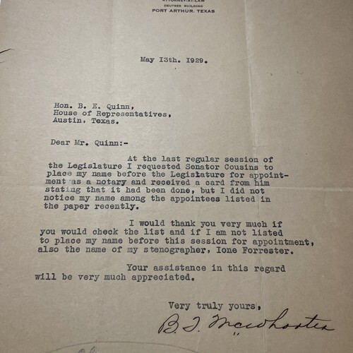 - antique letter Port Arthur TX B. T. McWhorter to State Rep. B. E. Quinn 1929