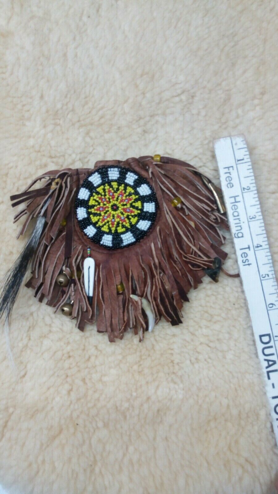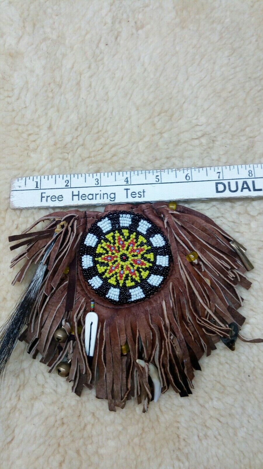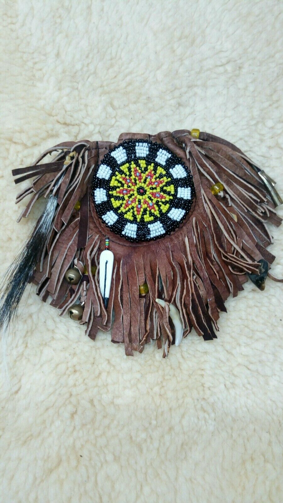 belt pouch medicine bag pow wow black powder rendezvous. small medicine pouch. hand fringed, sun burst bead work, skunk tail, bone feather, hawk bells, coyote tooth, yellow glass crow beads. 2 hoops in back for belt. 8X6 inches with fringing, 3 inch bag. pull closure. Condition is New. Shipped with USPS First Class.