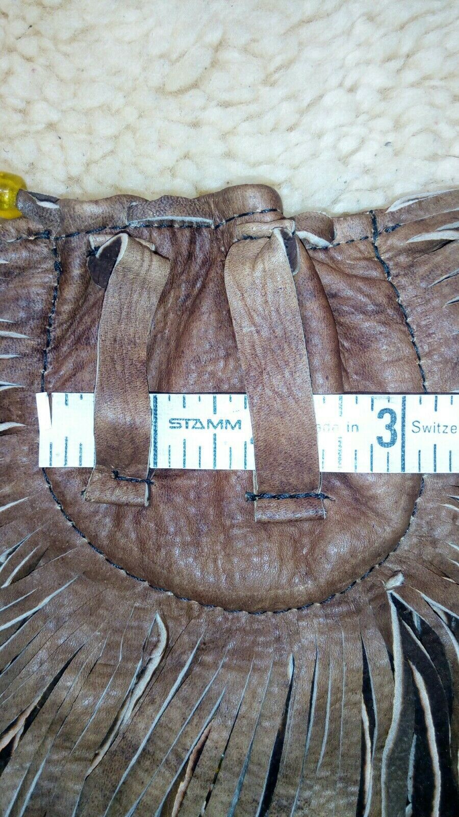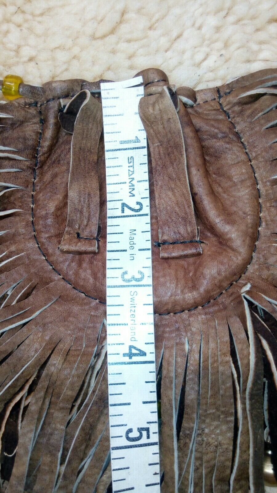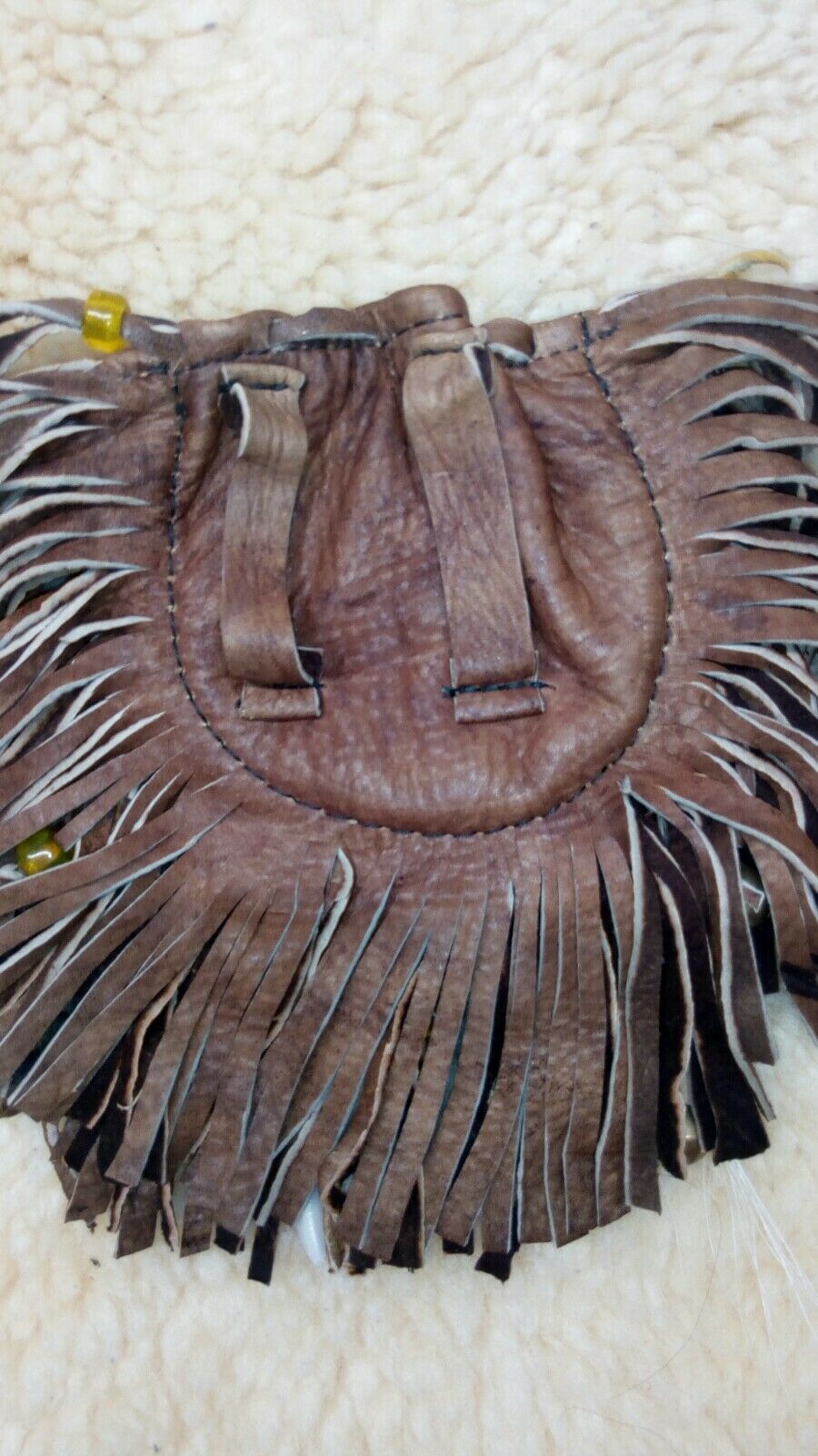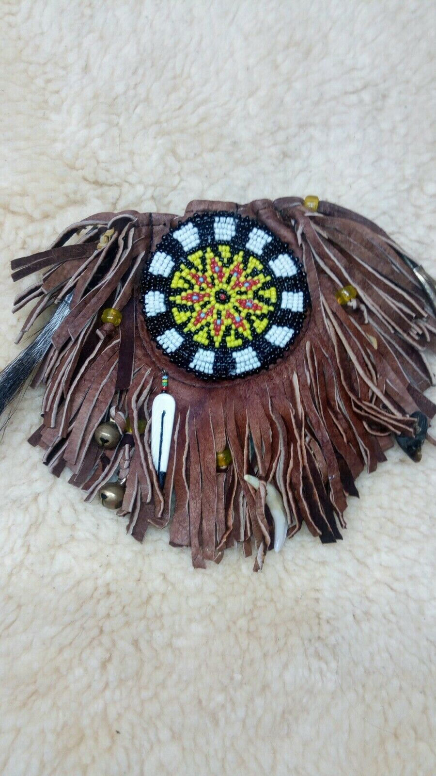 belt pouch medicine bag pow wow black powder rendezvous. small medicine pouch. hand fringed, sun burst bead work, skunk tail, bone feather, hawk bells, coyote tooth, yellow glass crow beads. 2 hoops in back for belt. 8X6 inches with fringing, 3 inch bag. pull closure. Condition is New. Shipped with USPS First Class.