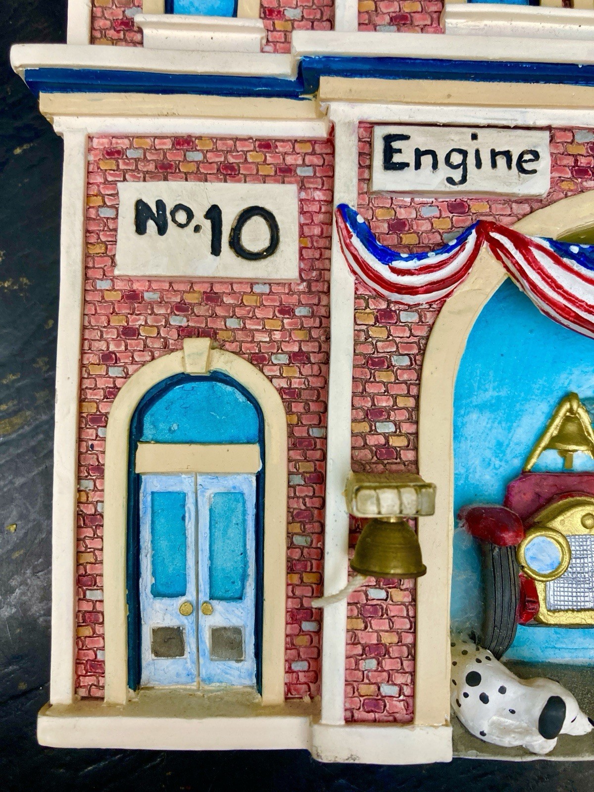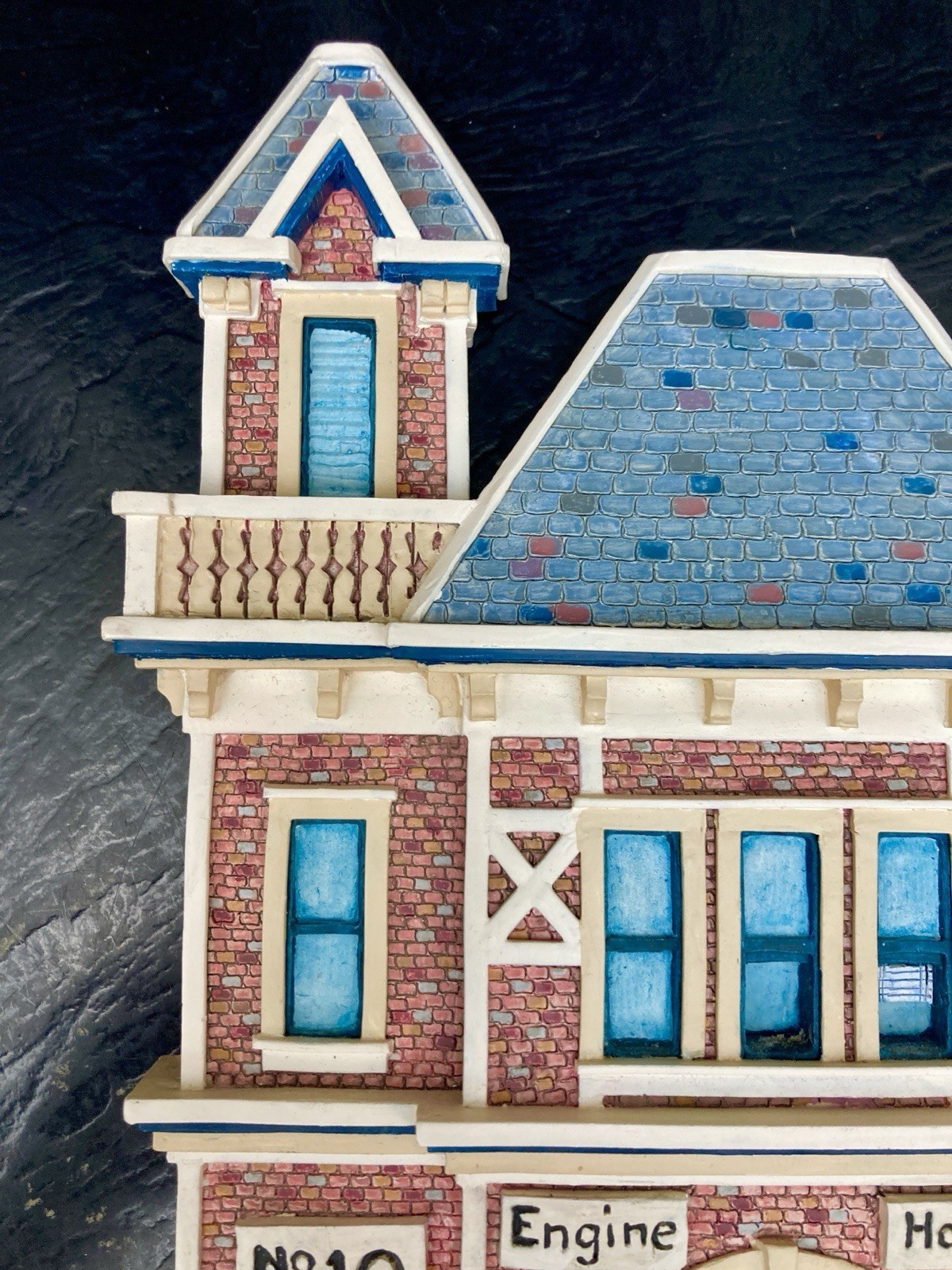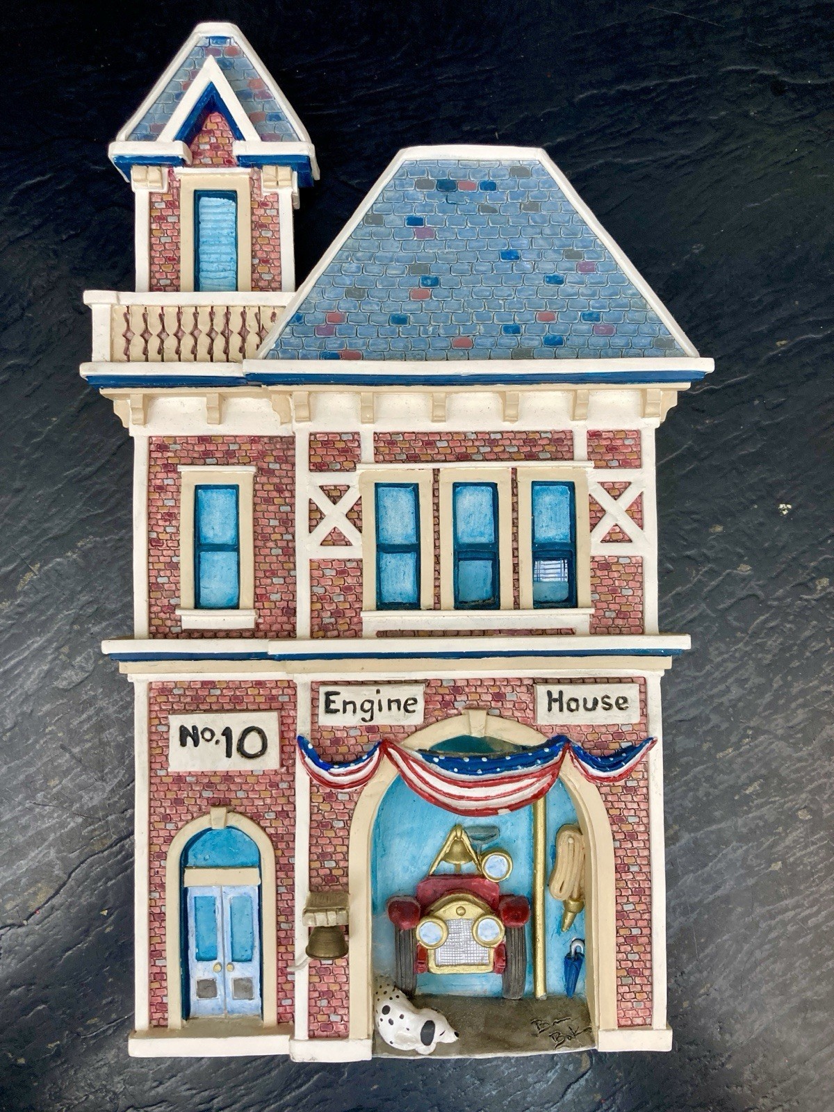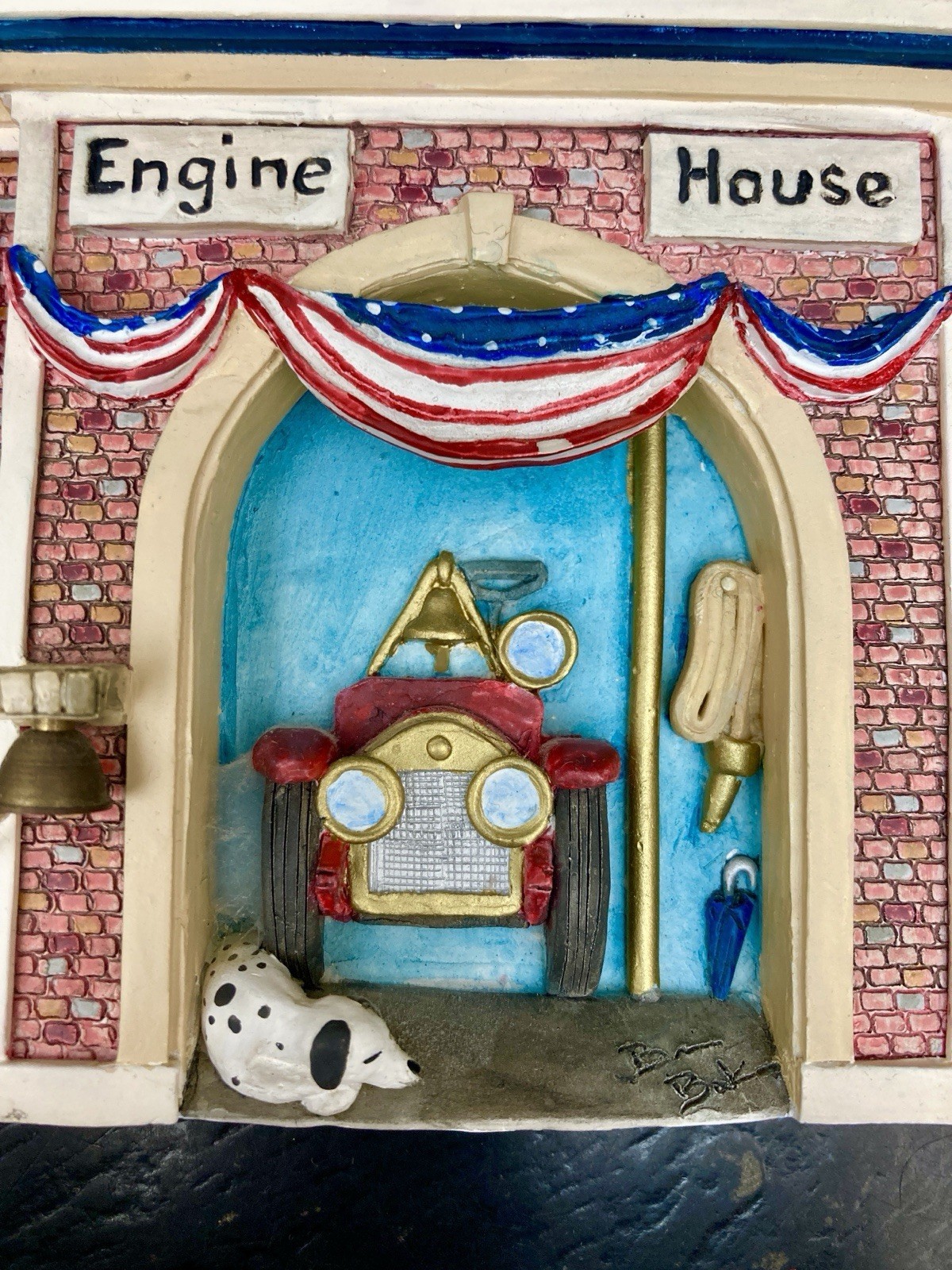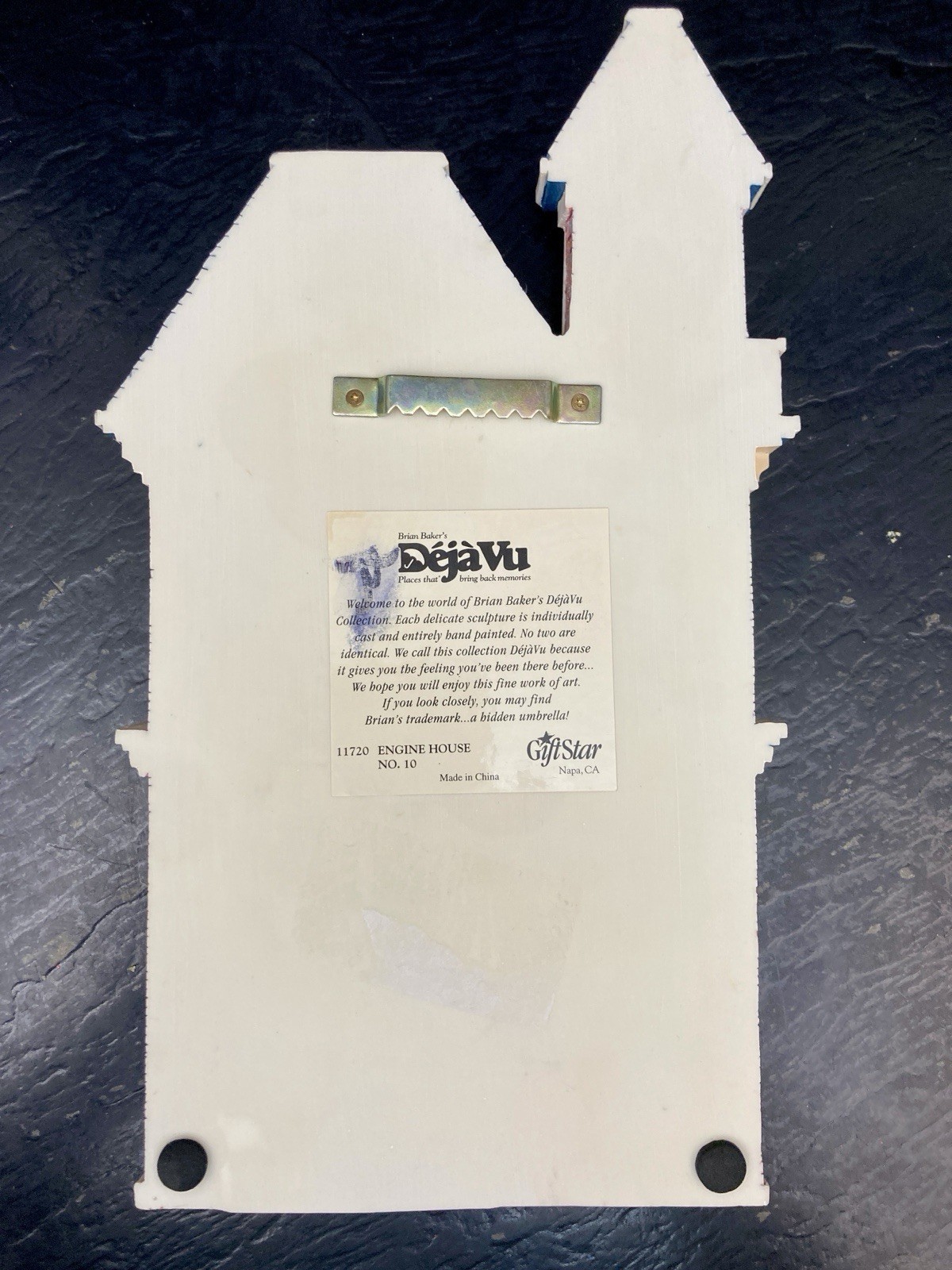 The Brian Baker Deja Vu Collection Engine House 10 is a unique multicolored resin sculpture depicting a fire house.