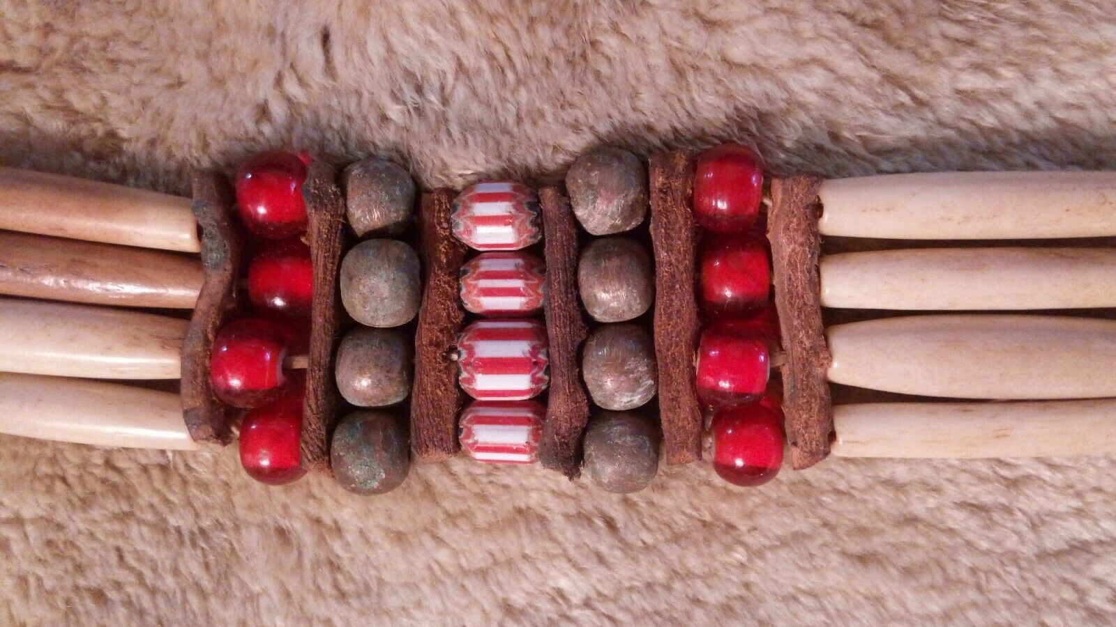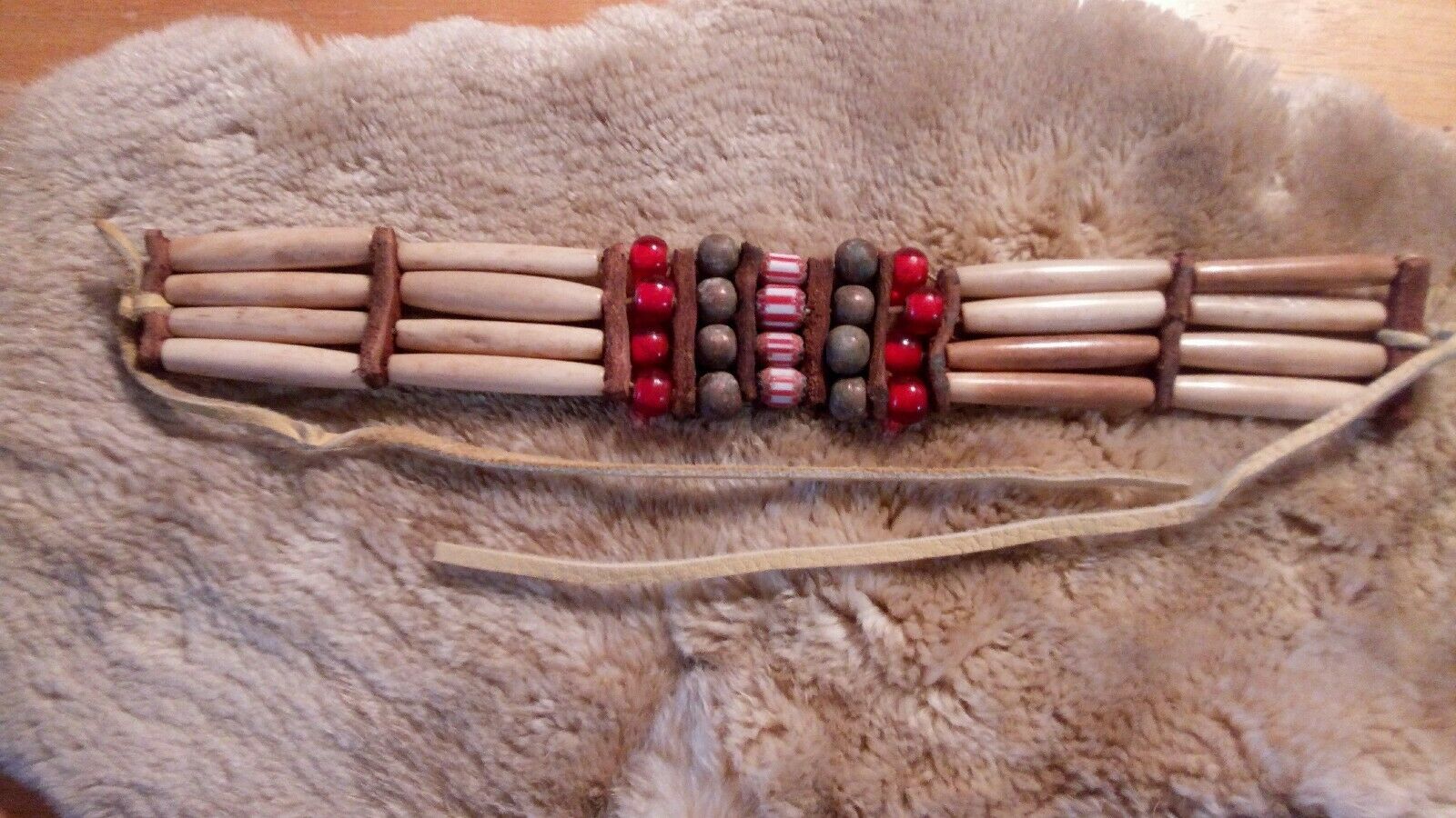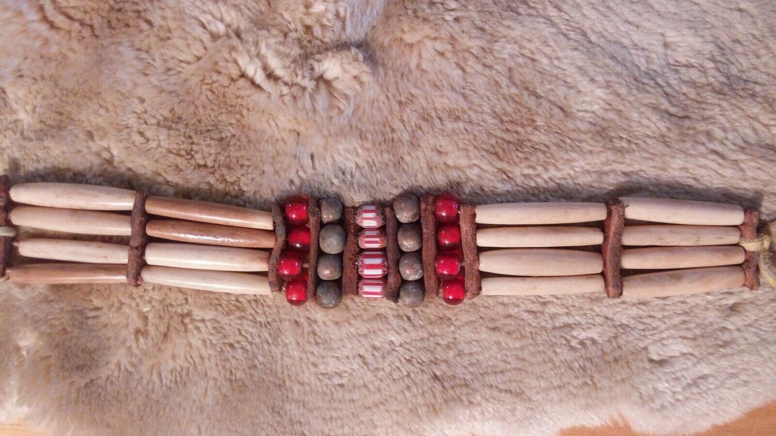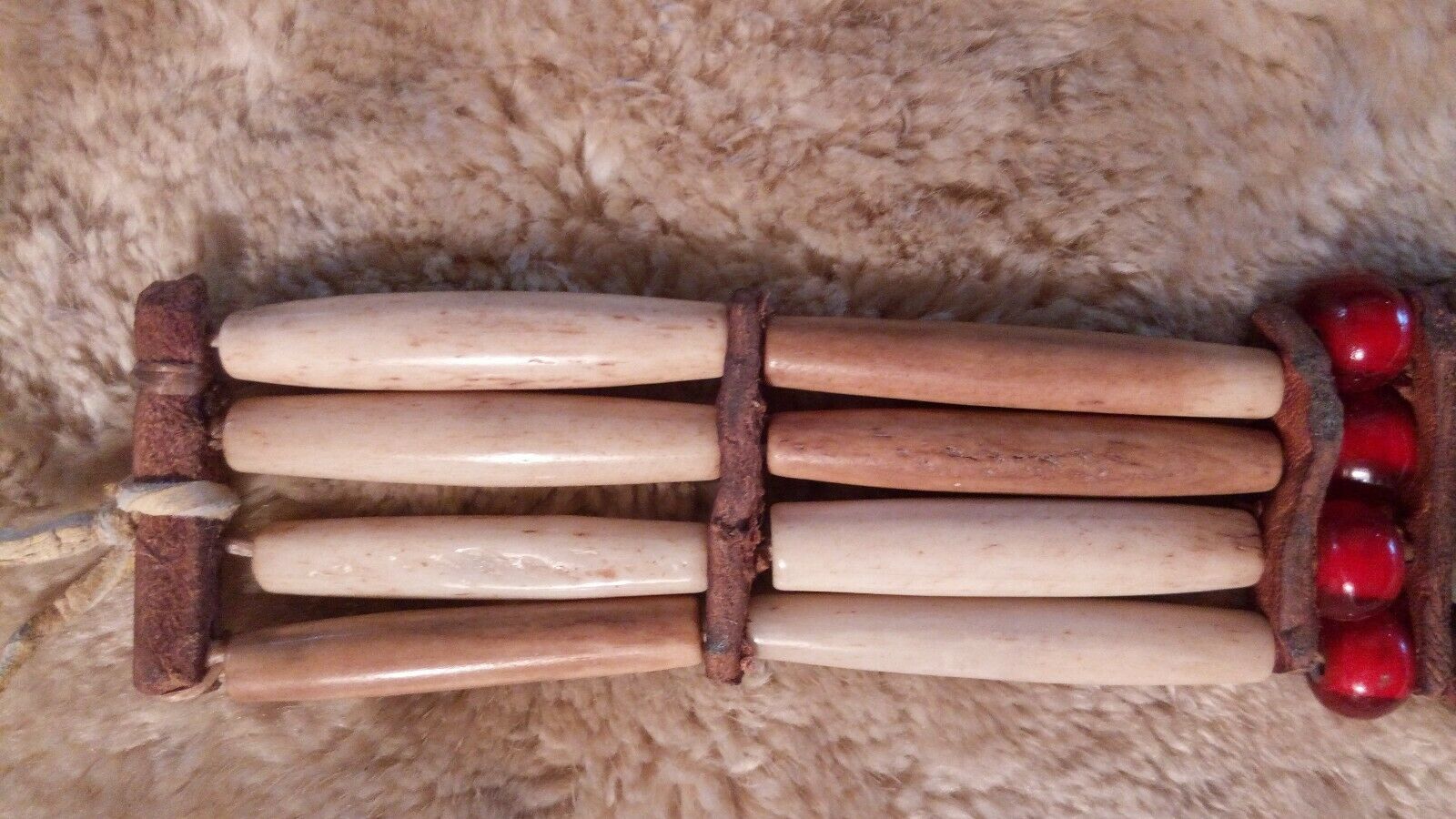 buffalo bone choker. Traditional native american choker. Latigo leather spacer, glass red heart beads, solid brass beads, glass red cheveron beads, buffalo hairbone. buckskin ties. overall lenght 25 inches, 9 inch choker, 1 1/2 inches wide. strung with imitation sinew. Shipped with USPS First Class Package.