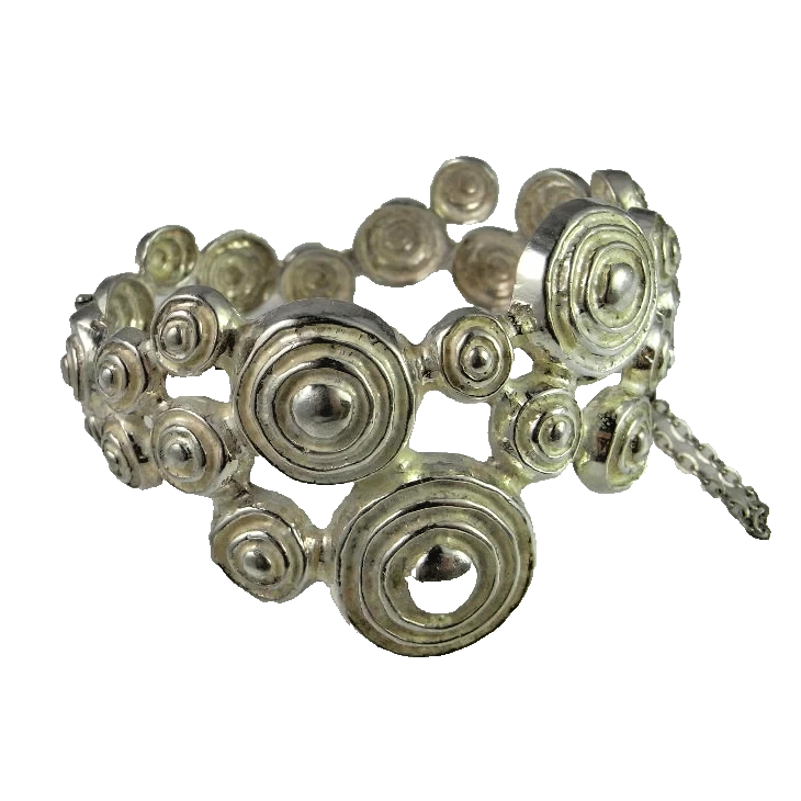 This gorgeous hand made bangle is exquisitely crafted and looks exceptional on the wrist. The design which is slightly asymmetric is reminiscent of spirals used in ancient design. It is a unique piece and a rare find on the market today.