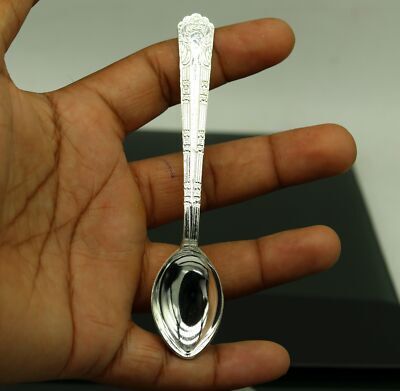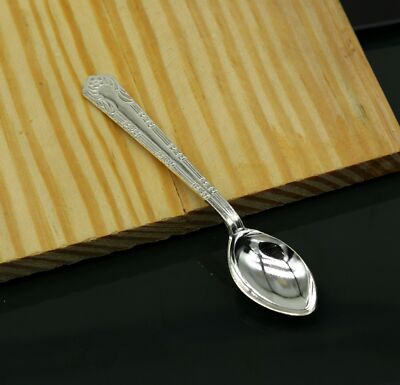 fine silver handmade spoon, excellent gifting home dining decor silver vessels, indian opinion is silver has proven antibacterial properties. It is believed that eating out of the same is healthy and can help prevent disease-causing bacteria from spreading. This is one of the main reasons medicines are given to babies in silver bowls or trays. we can also use silver vessels in home temple for puja, Diwali puja. Metal- pure sterling silver. Item Type-Silver Vessels/ spoon Weight-9.410 spoon. length-4.2" inches. width maximum-2.2 cm approx. Makes excellent gifting and collectible pieces.