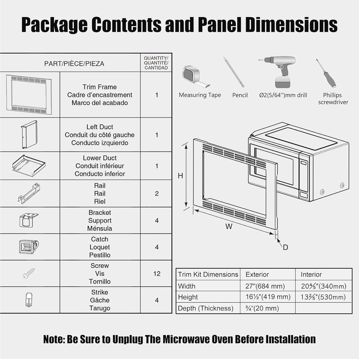 ?Easy Installation?To make installation faster and easier, please prepare a tape measure, pencil, Phillips screwdriver, and a O 2 mm (5/64?) drill bit in advance. The 27-inch microwave trim kit includes a detailed multilingual manual (English, French, Spanish) with step-by-step diagrams, and you can also search ?TK621SS? on YouTube for a visual guide.