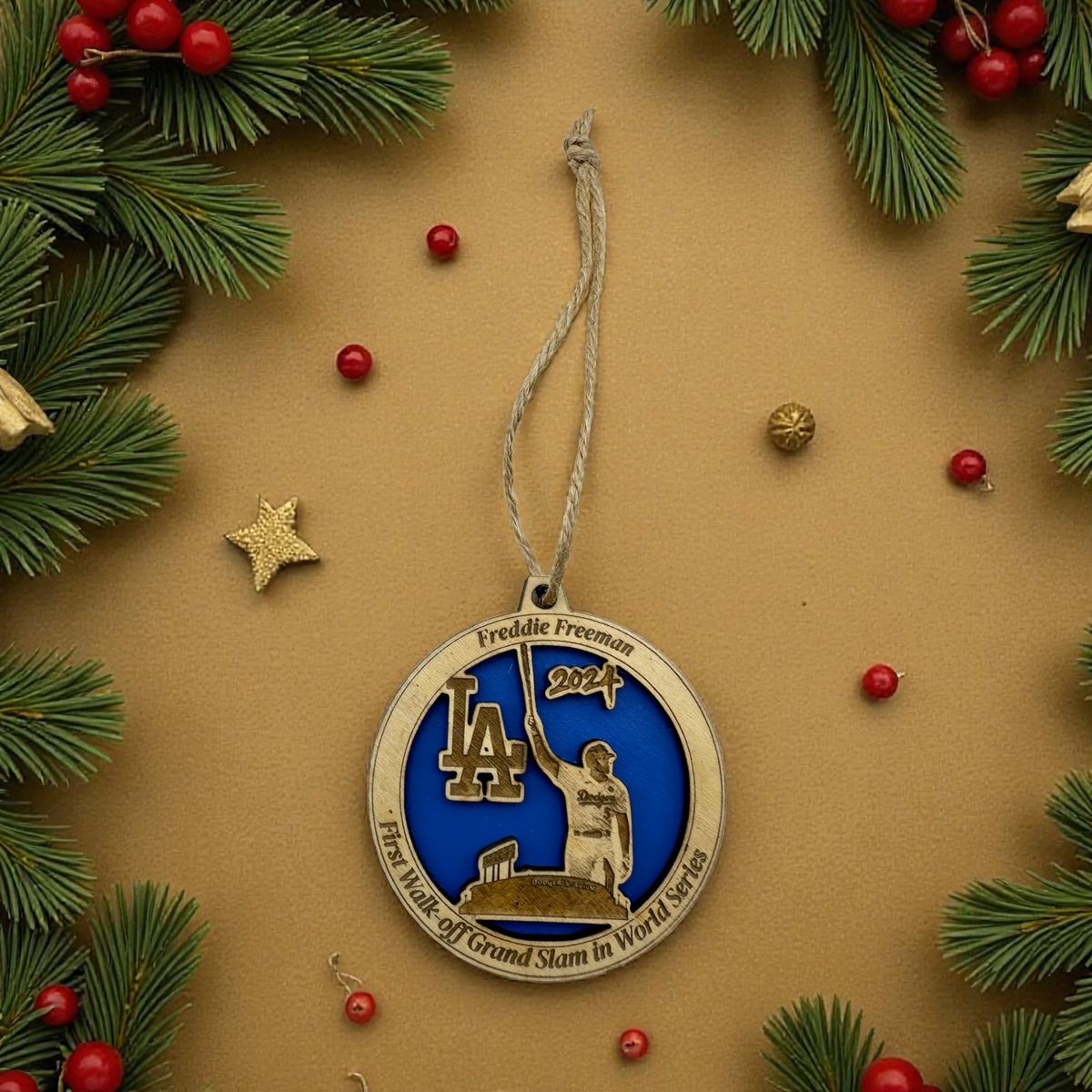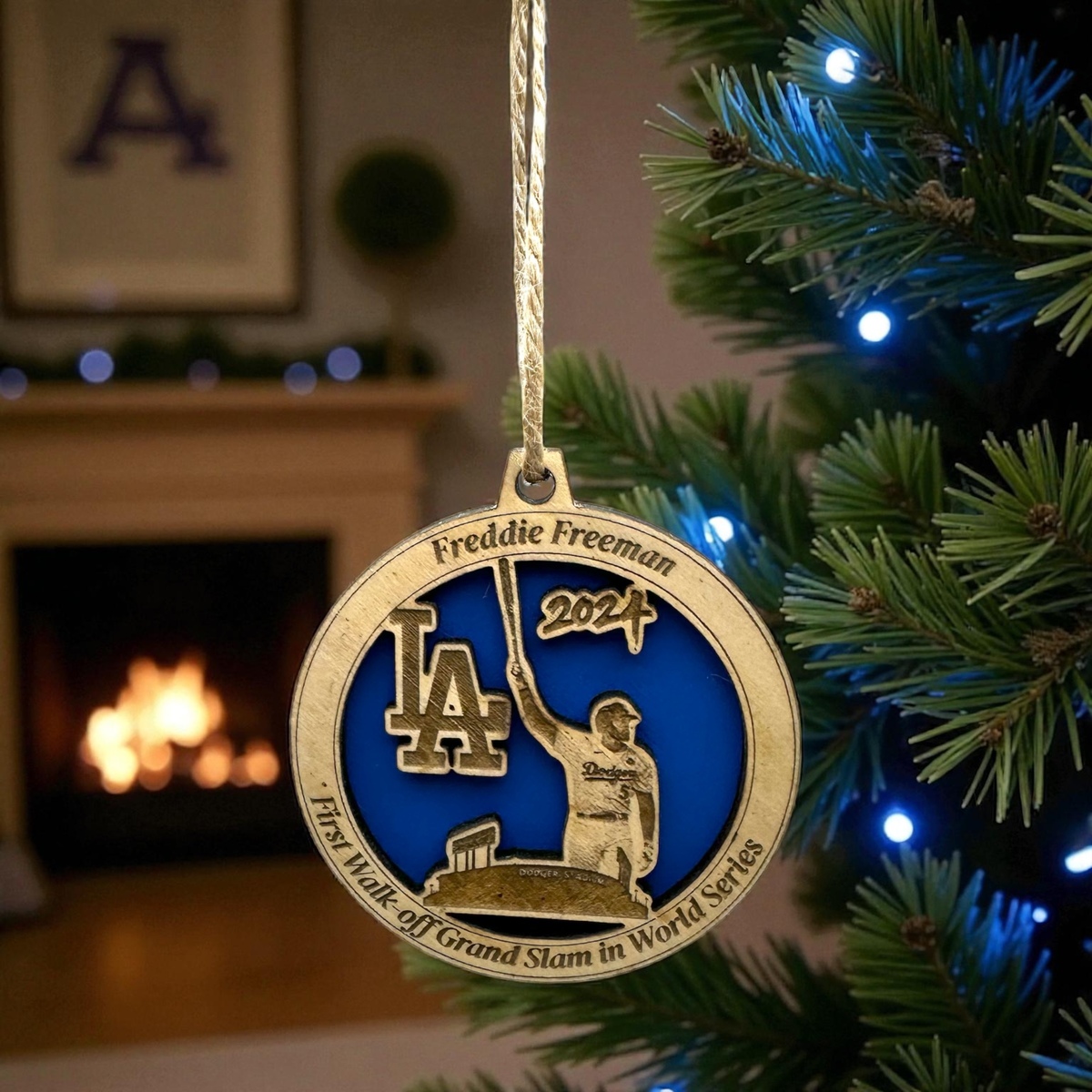 Celebrate a legendary moment in Dodgers history with this two-layer wooden Christmas ornament. The front layer, a beautifully laser-engraved Freddie Freeman in his iconic grand slam pose from the World Series, stands out against a backdrop of Dodger blue. This unique, two-dimensional design captures the excitement of that unforgettable home run, making it the perfect piece to hang on your tree and remember the moment forever. A must-have for any Dodgers or Freddie Freeman fan!