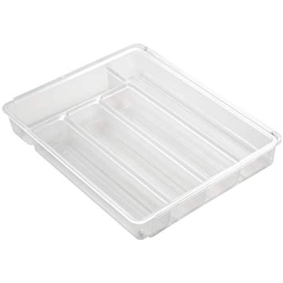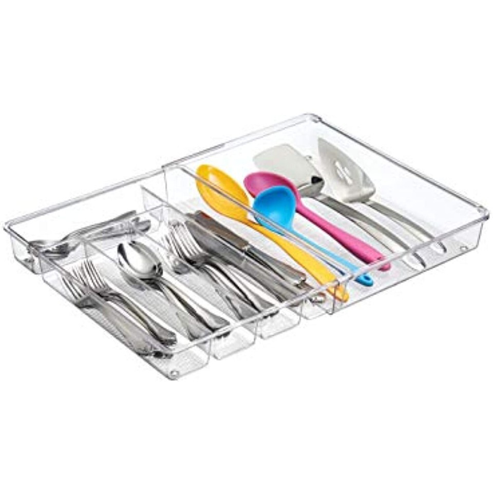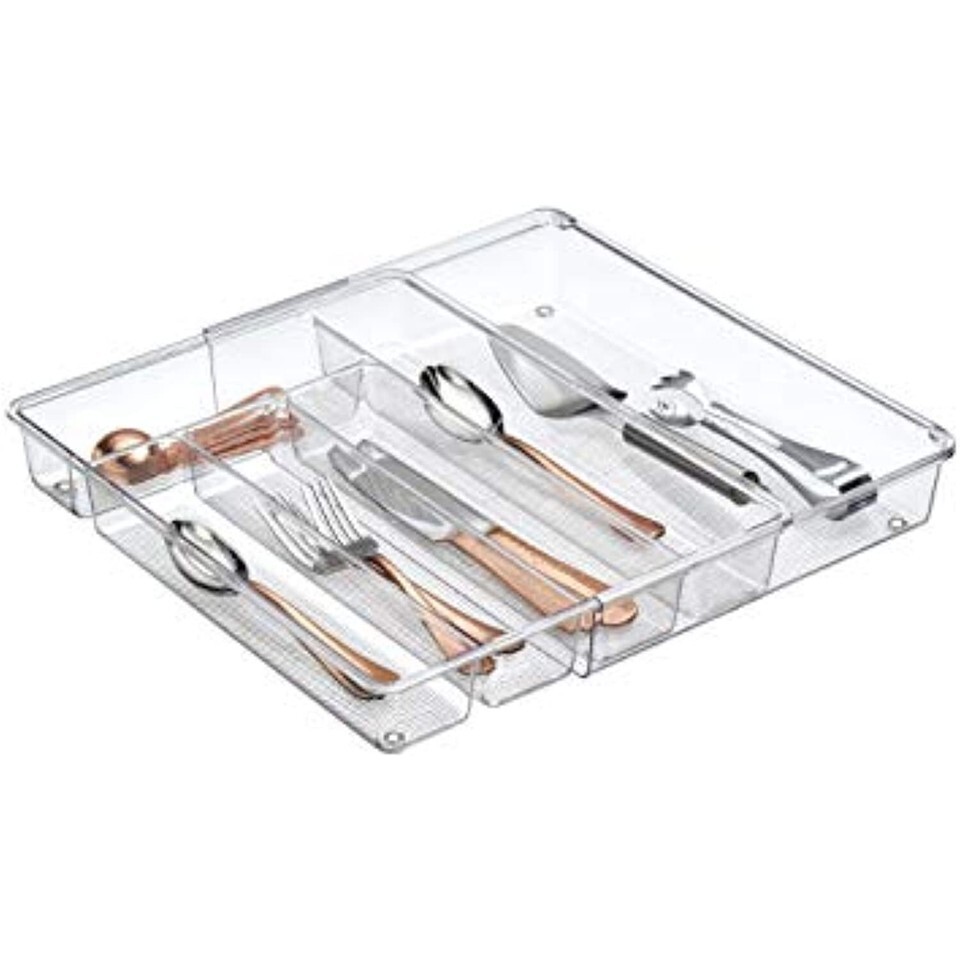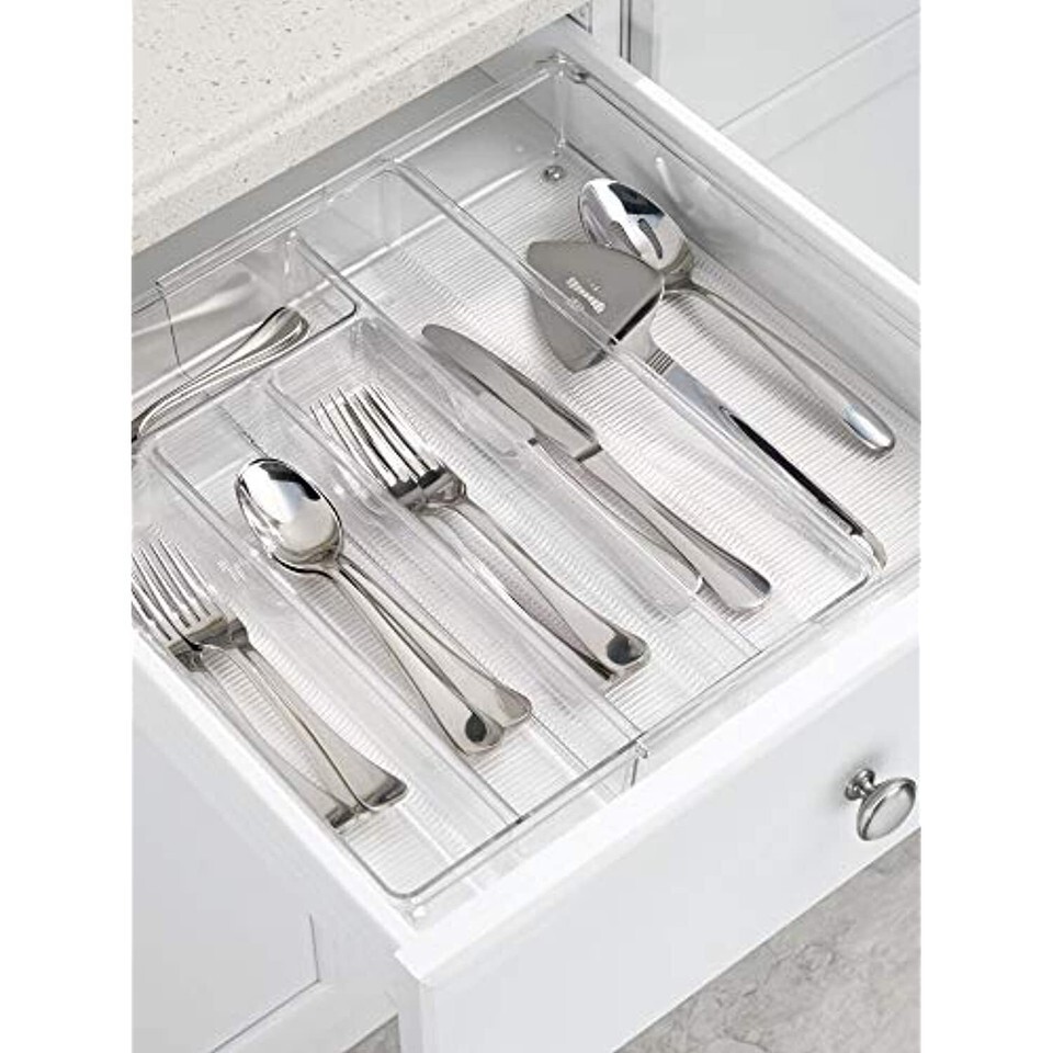 Keep your space clean with the iDesign Linus Expandable Kitchen Drawer Organizer! This transparent storage box is constructed of clear, durable plastic, allowing you to see your items with ease. It features ribbing detail on the bottom and non-skid silicone feet to prevent sliding in your drawer or on your countertop. This drawer organizer is designed with five compartments but can be expanded up to 20 inches to include a sixth compartment perfect for larger utensils like spatulas, whisks, pizza cutters, and more. Organize your silverware in the five compartments to keep forks, knives, and spoons separated. Measuring 11.25" x 14.25" x 2.25", the iDesign Linus Expandable Kitchen Drawer Organizer is great for use in your kitchen! With iDesign by InterDesign, you can #LiveSimply every day.