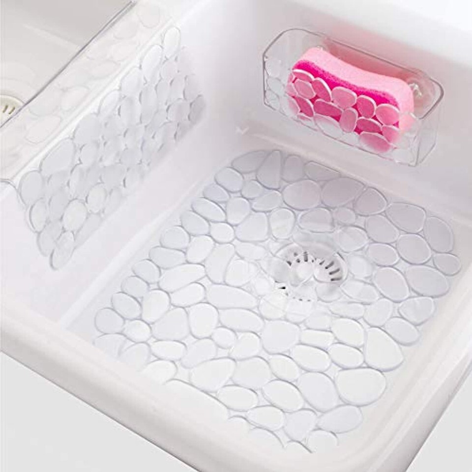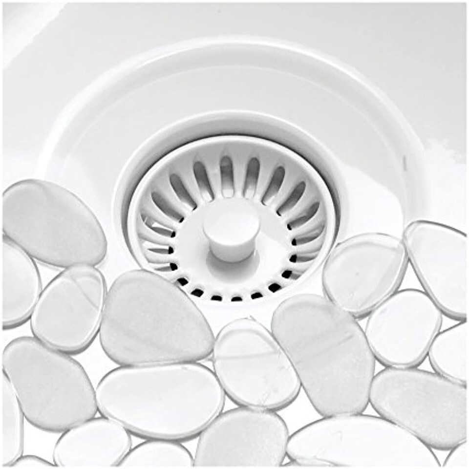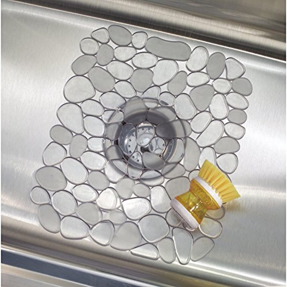 Protect your kitchen sink in style with the iDesign Pebblz Sink Mat. This kitchen sink liner protects the sink as well as dishware, flatware, glasses, pots, pans, and more from scratches and damage during washing and drying. The open design allows water to drain through the mat, and the flexible PVC material grips the sink so it stays in place while in use. The versatile design is compatible with any type of sink including stainless steel, metal, and ceramic, and it can also be used in bathroom, laundry room, and utility sinks. The transparent color with pebble pattern adds a decorative touch to the sink, and it matches other items in the Pebblz collection (sold separately) to add coordination to your kitchen decor. Made with durable BPA-free PVC plastic, this sink mat stands up to every day use and is dishwasher safe for easy cleaning and care. Measuring 10.75" x 12.5", this sink protector can be adjusted by cutting away pebbles to provide a custom fit for a variety of sink sizes. With iDesign by InterDesign, you can #LiveSimply every day.