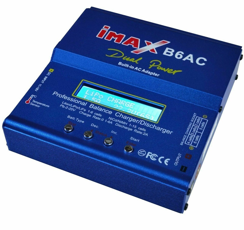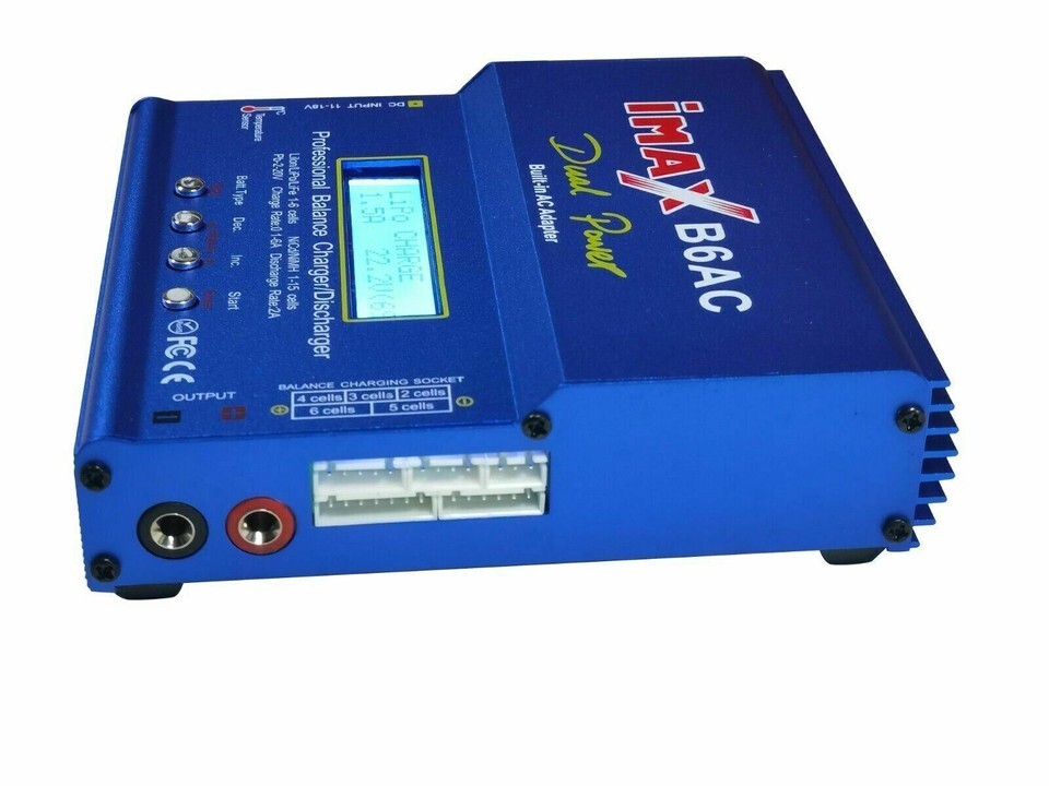 IMAX B6 AC is the new professional intelligent multifunction charger/discharger with dual power which can charge and discharge, Li-ion, LiPo, LiFe, Pb, NiCd and NiMH batteries.
