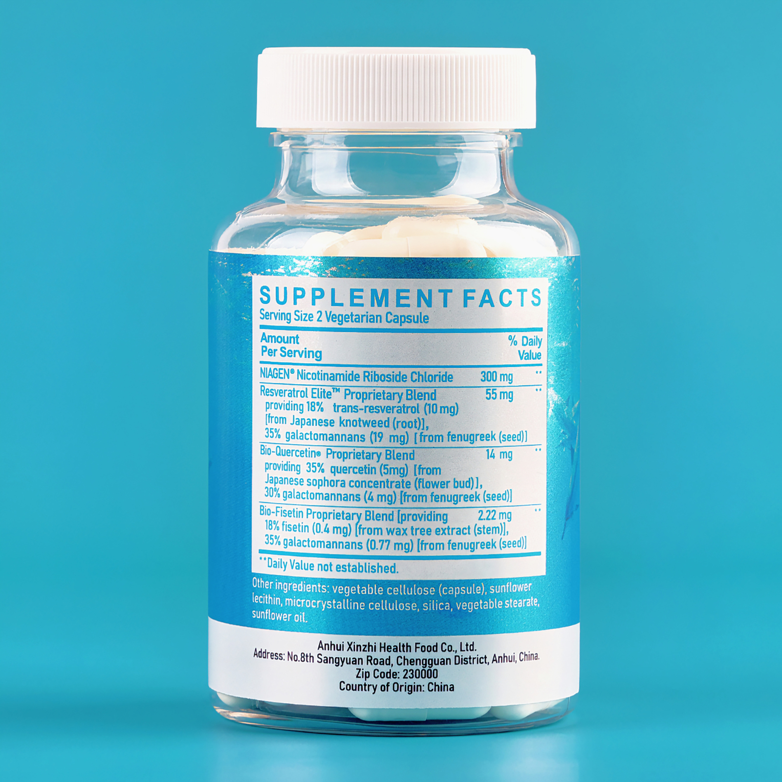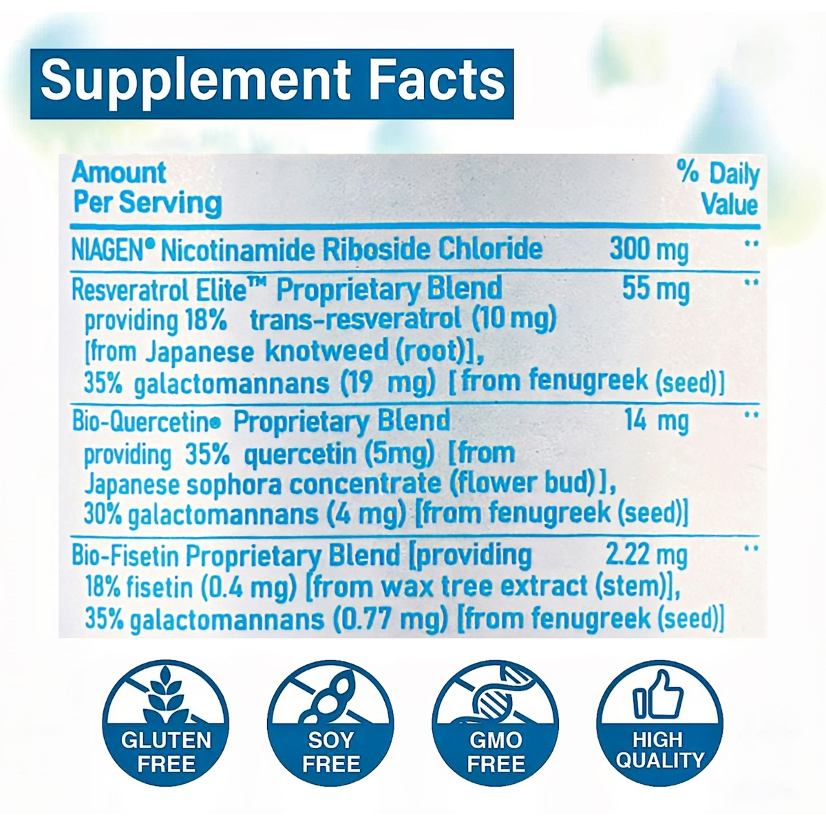 - **Promotes Overall Wellness**: With the combined power of **Nicotinamide Riboside**, **Resveratrol**, and **Quercetin**, this supplement supports a variety of bodily functions, from metabolism to immune health, offering a comprehensive solution to feel your best every day.