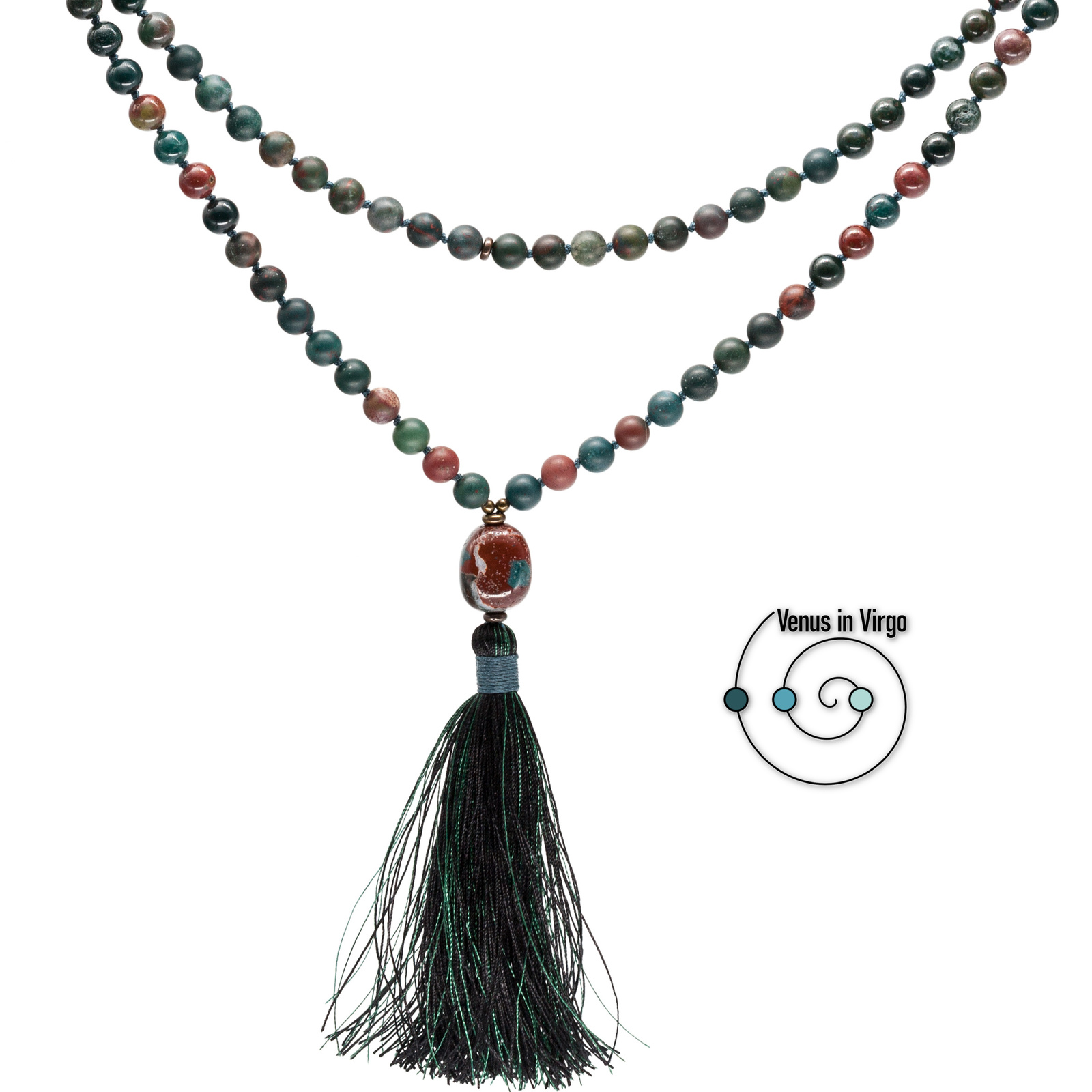 This one-of-a-kind mala is carefully hand-knotted using natural Indian bloodstone — a striking gemstone known for its grounding energy and its rich blend of deep greens and rusty reds. Each of the 108 6mm beads is selected for harmony and balance, arranged symmetrically by tone to mirror the subtle dance of earth and blood within the stone.