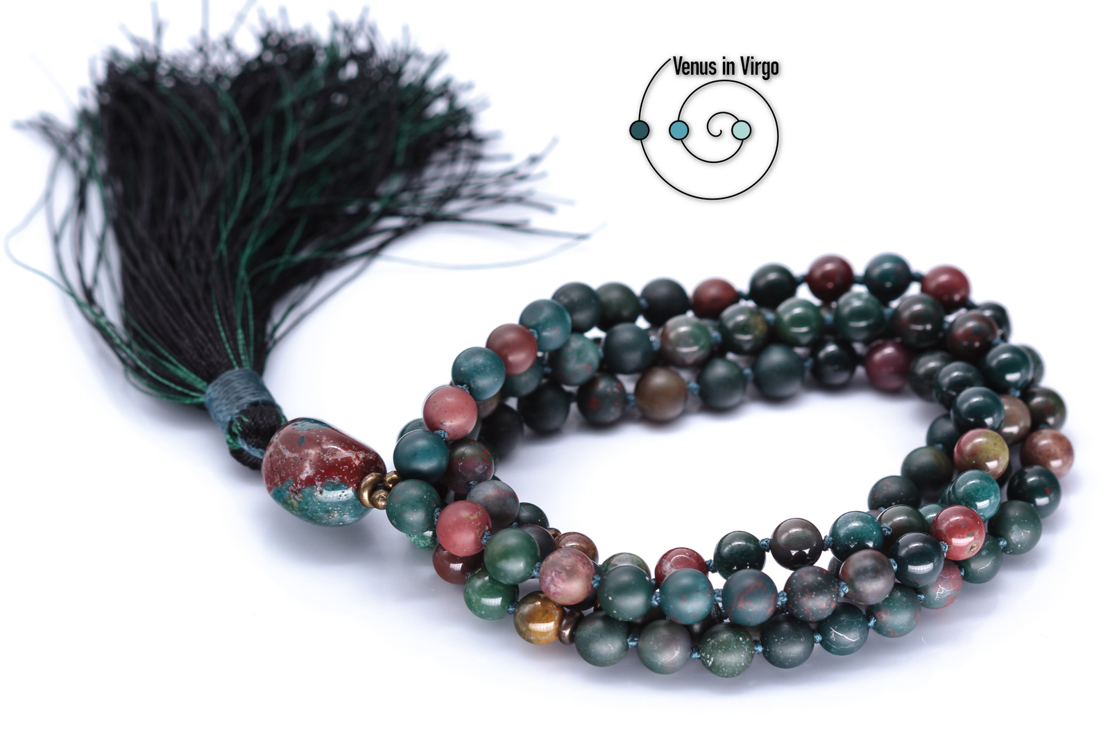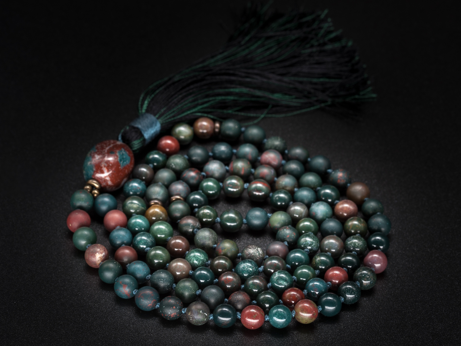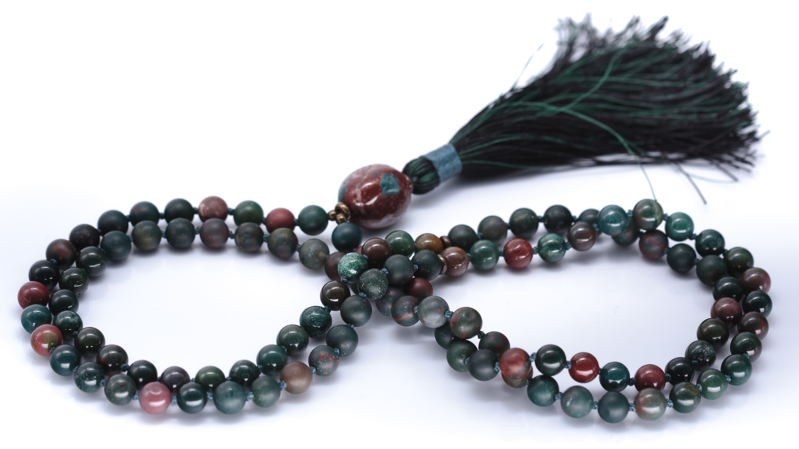- individually made in USA, hand knotted 108 mala beads, bloodstone, green, red