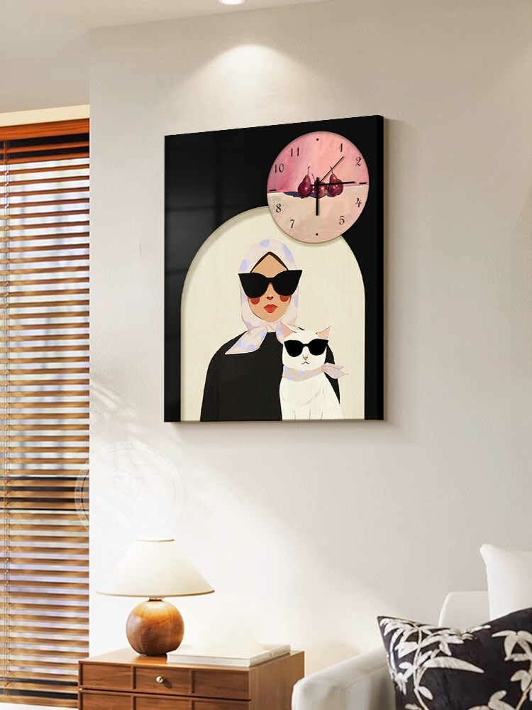 Product description: Transform your living space with this sophisticated wall clock art panel that seamlessly blends timekeeping with artistic expression. The stunning cream-colored design features whimsical illustrations on a premium engraved crystal ceramic surface, creating an eye-catching focal point for any room. Measuring 19.7 15.7 inches, this versatile piece is perfectly sized for living rooms, dining areas, or elegant hallways. The precision silent quartz movement ensures peaceful timekeeping without disturbing ticks, while the durable black aluminum alloy frame provides a sleek, contemporary finish. The artwork's neutral palette and stylish elements complement modern and minimalist interior designs, making it an ideal accent piece above dressers or as a statement installation. Each detail of this clock art panel has been thoughtfully crafted to deliver both functionality and refined aesthetics, elevating your home's ambiance with its unique combination of artistry and practicality.