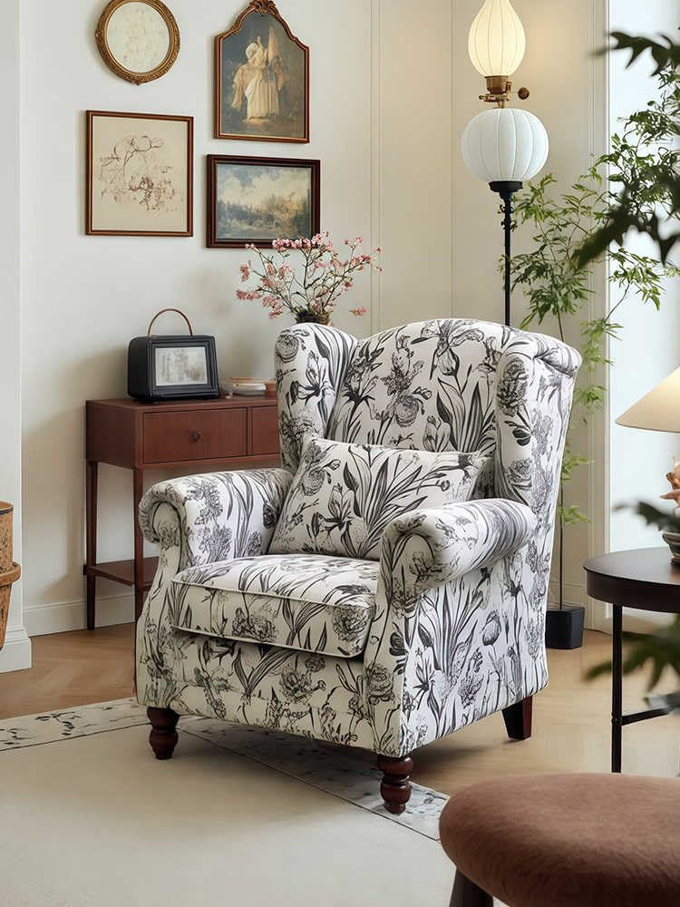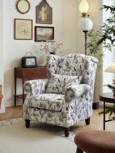 Product description: Elevate your living space with the Vintage Floral Tiger Chair, a stunning blend of artistic design and practical comfort. This retro armchair features bold black-and-white pastoral floral upholstery that makes a striking statement in any room. The sculpted wingback silhouette, rolled arms, and hand-turned wooden legs create an elegant profile that serves as both functional seating and a conversation piece. Crafted with a solid hardwood frame and thick high-density padding, this chair offers exceptional durability and everyday comfort. The deep, wide seating area (34.65" width, 29.53" depth, 38.98" height) includes a plush removable lumbar cushion and ergonomic high-back support?perfect for reading, lounging, or creating a cozy conversation corner. The easy-clean covers and robust construction make this chair ideal for modern cottage, designer, or eclectic interiors. Whether used as a standalone reading chair or as part of a grouped seating arrangement, this Interoknack Tiger Chair brings vintage charm and practical comfort to residential spaces, boutique hotels, or creative studios.