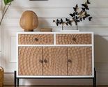 Product description: Discover the perfect fusion of artisanal craftsmanship and contemporary design with this striking Wabi-Sabi Vintage Distressed Sideboard. At 49.6x15x35.4 inches, this distinctive piece showcases five meticulously hand-carved wood panels featuring mesmerizing geometric patterns, sunbursts, and diamond motifs that create captivating visual depth. The sophisticated design marries weathered wood textures with a pristine white frame, supported by elegant black steel legs that add industrial sophistication. Two spacious drawers and a three-door cabinet section provide versatile storage options, making it ideal for multiple settings - from a statement entryway piece to a bedroom storage solution. Each sideboard is uniquely crafted, with the natural variations in wood grain and hand-carved details ensuring no two pieces are identical. The thoughtful contrast between rustic carved elements and modern structural details celebrates the beauty of imperfection, while the combination of solid wood construction and steel accents promises enduring style. Perfect as a distinctive focal point in both residential spaces and boutique hospitality settings.