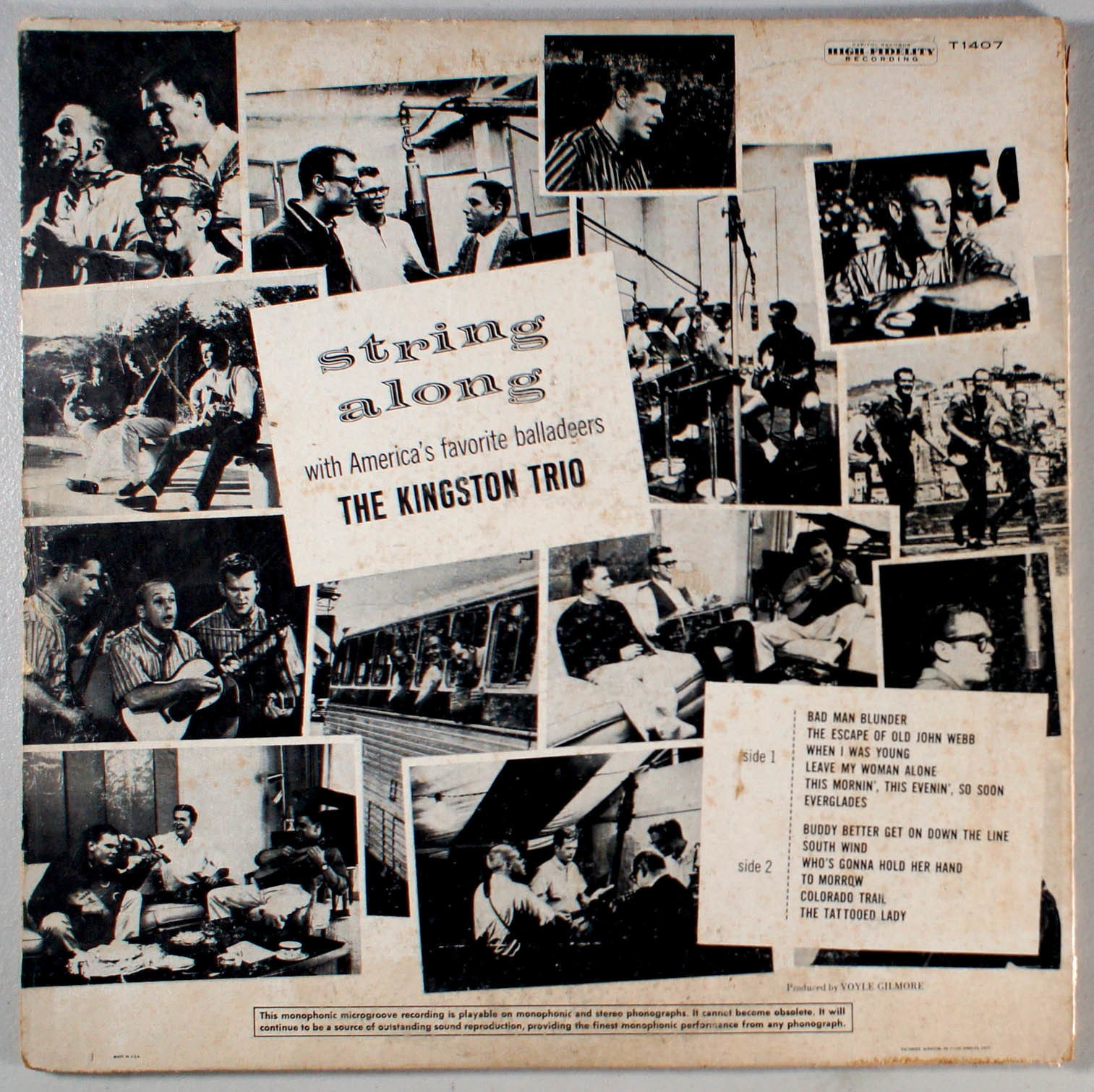 String Along has the most unusual sound of any Kingston Trio album, mostly by virtue of the crisp mixing and voicing of the instruments -- guitars and banjo all appear in very high relief, matching the attention usually reserved for the voices on the Kingston Trio's records. The result is a somewhat quieter record, without much presence of the familiar unified group sound, as the individual members are relied upon more than the ensemble singing on many of the songs. One of the few exceptions is Buddy Better Got On Down the Line, which has the sound that one associates with past trio recordings. But it's a true exception on an album that has other highlights such as oddities like the trio's surprisingly strong rendition of Ray Charles' Leave My Woman Alone. Though no one could have realized it at the time, String Along was very close to the tail end of the original Kingston Trio's history -- Dave Guard was losing interest in arguing over the direction of the group; and although their albums were still selling well and steadily, String Along (which hit No. 1) would yield the original group's last two charting singles. Bad Man's Blunder, which also opens this album, became the original Kingston Trio's final Top 40 single; it was cut by the trio and issued as a single as a favor to composer Cisco Houston who was in the hospital and terminally ill. Other songs were done for more mundane reasons -- according to Benjamin Blake, Jack Rubek, and Allan Shaw in their book The Kingston Trio on Record, the English folk-style The Escape of Old John Webb was featured on the album in the hope of helping to persuade EMI Records in England to promote the trio's albums more vigorously.