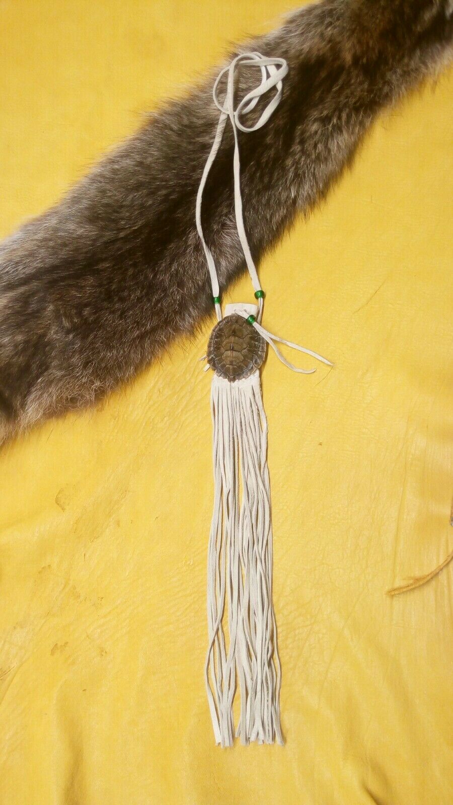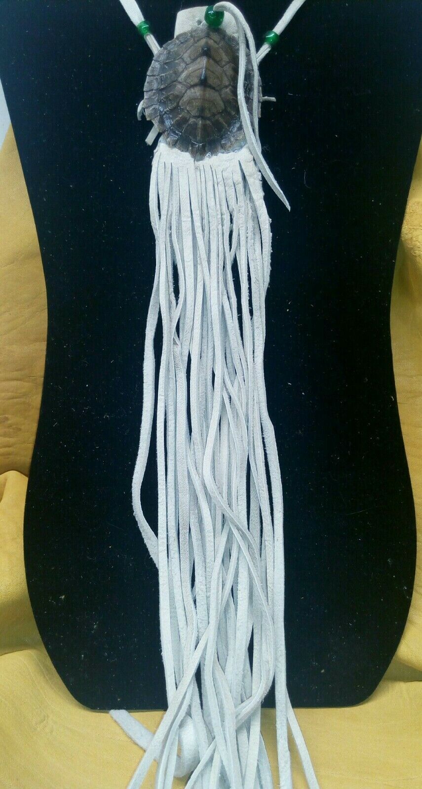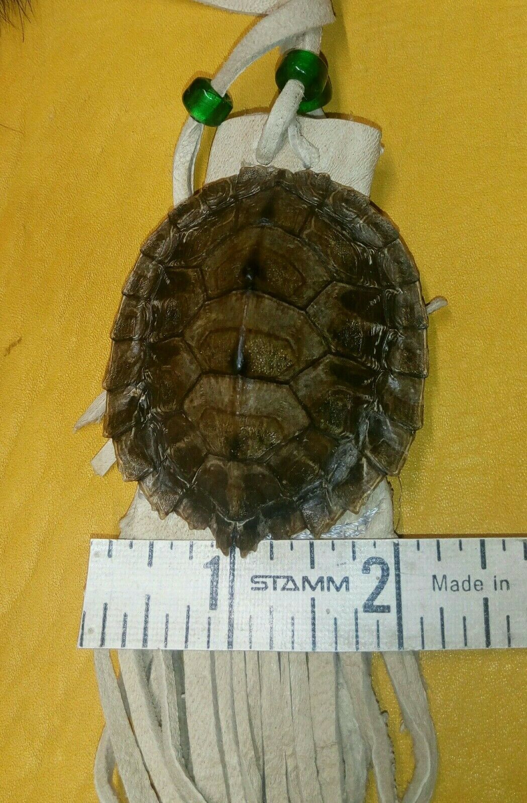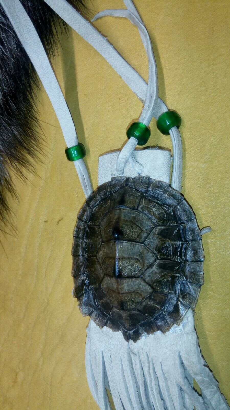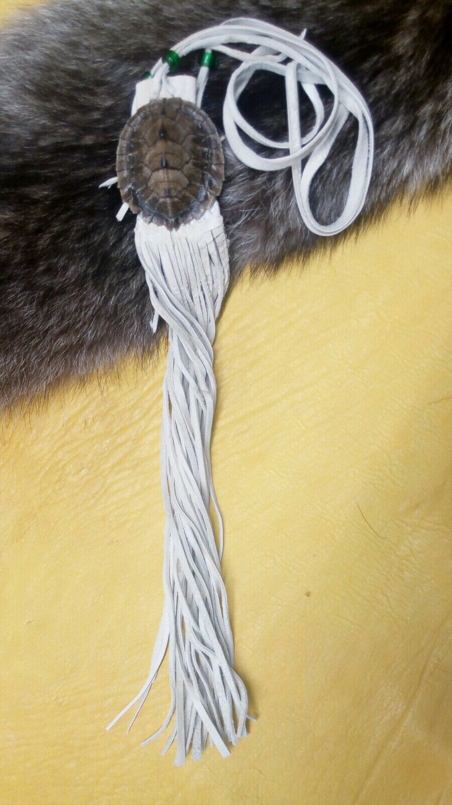 map turtle pouch medicine pouch black powder pow wow reenactment. map turtle pouch, 2X2 1\2inches, light tan buckskin, green glass crow beads, 11 inches of fringing. 36 inch single strap. Condition is "New". Shipped with USPS First Class.