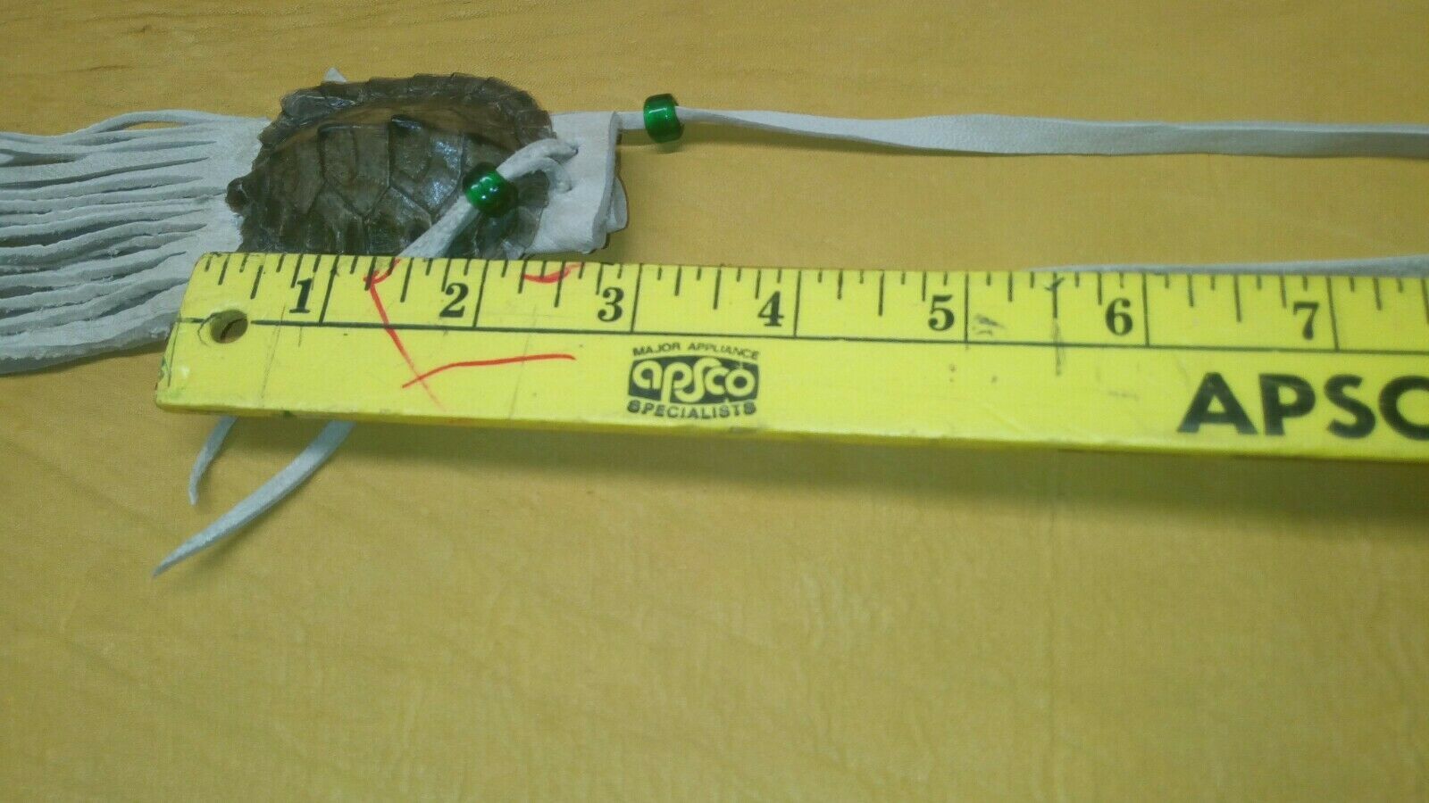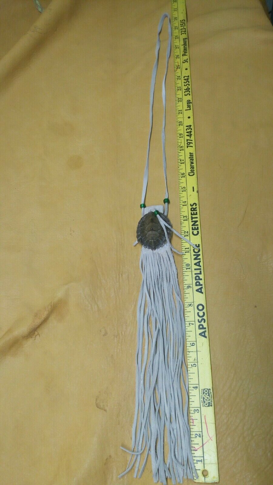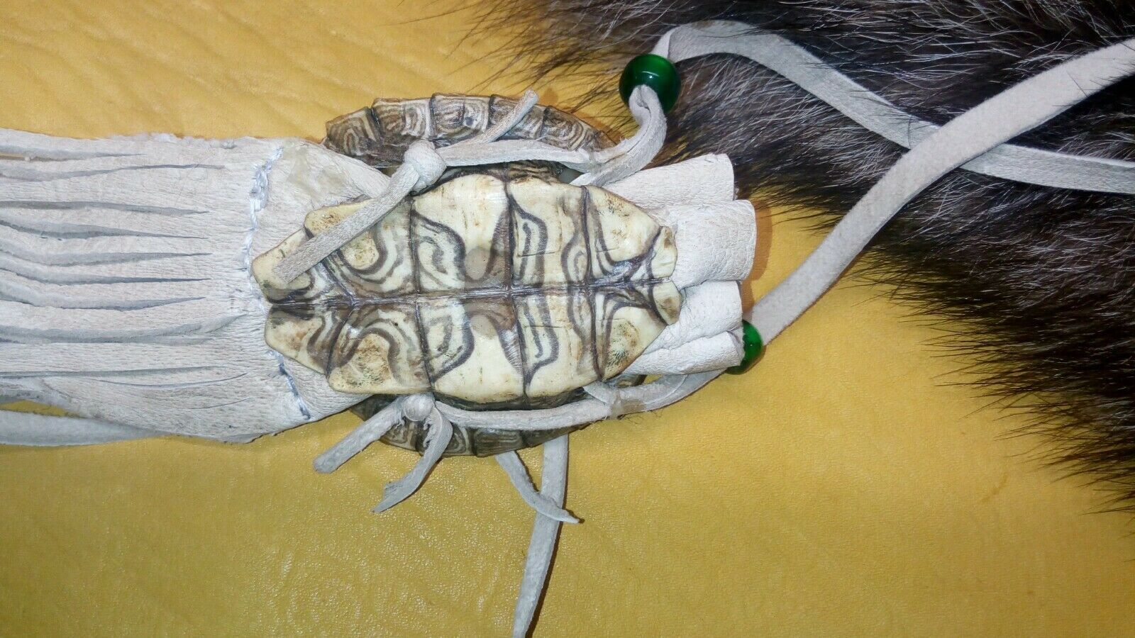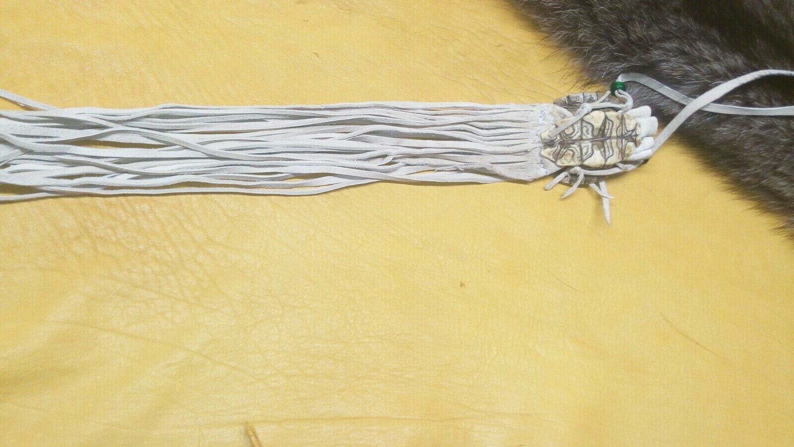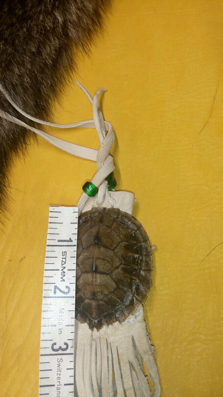 map turtle pouch medicine pouch black powder pow wow reenactment. map turtle pouch, 2X2 1\2inches, light tan buckskin, green glass crow beads, 11 inches of fringing. 36 inch single strap. Condition is "New". Shipped with USPS First Class.