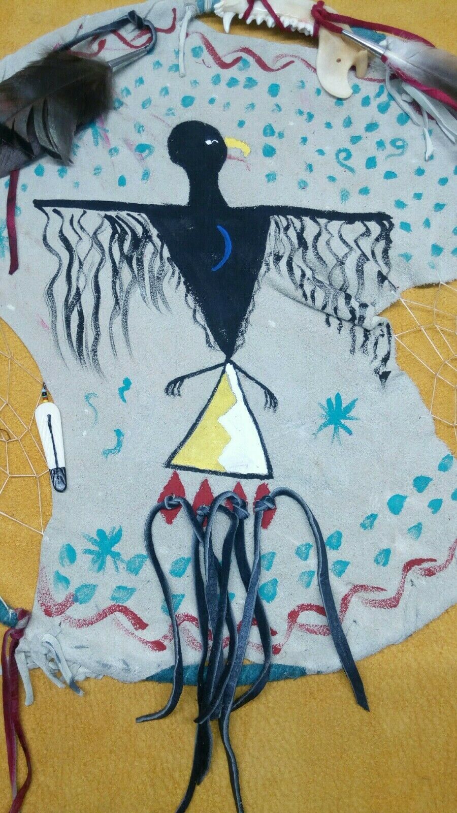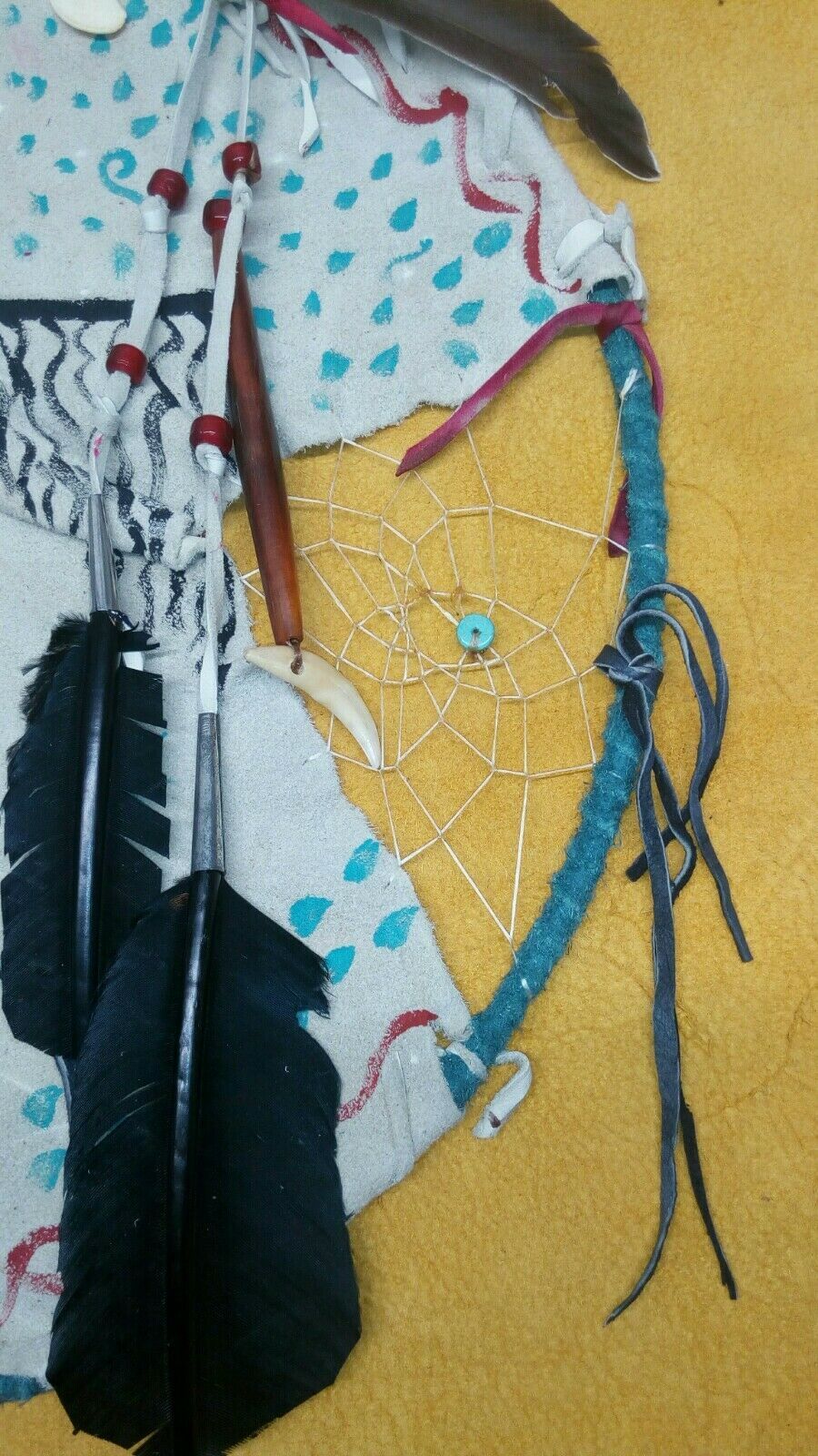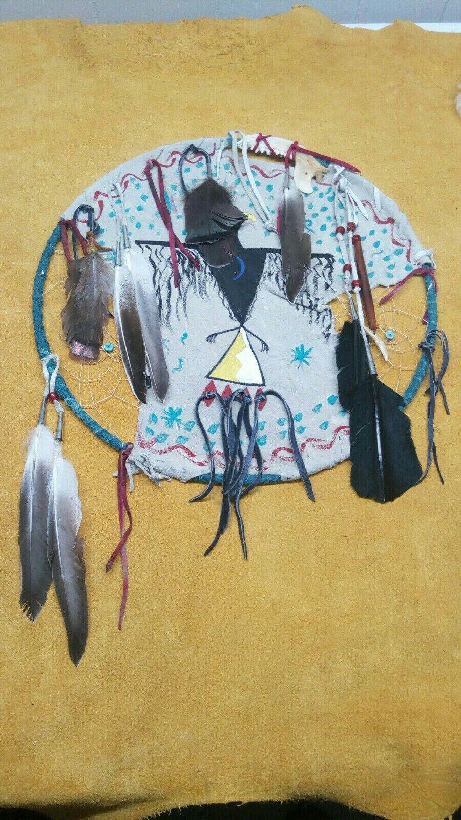 native american style mandala .western american black powder powwow. traditional style shield, Thunderbird shield with symbols of water, 2 dreamcatchers woven in, with imatation sinew. made of deer buckskin, wild turkey tail feathers in tin cone, duck feathers in tin cones, With dyed turkey feathers, .each dreamcatchers has a turquoise stone. bone feather, buffalo horn hairpipe with a coyote tooth. red glass crow beads. deer buckskin wrapped around 14 inch brass ring. hand stitched. traditional style