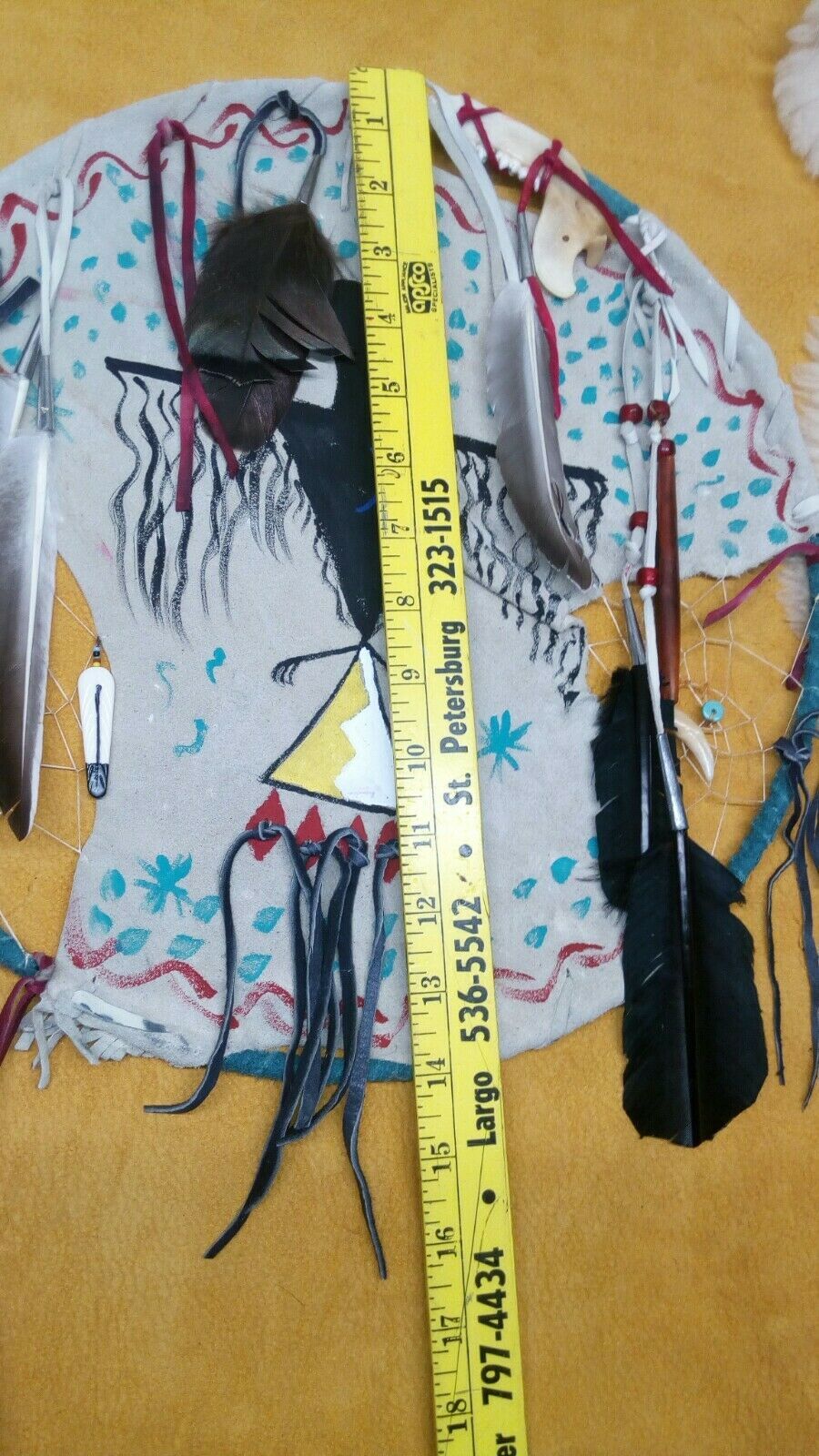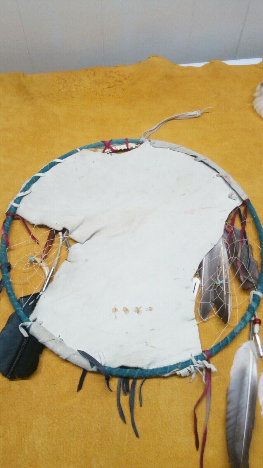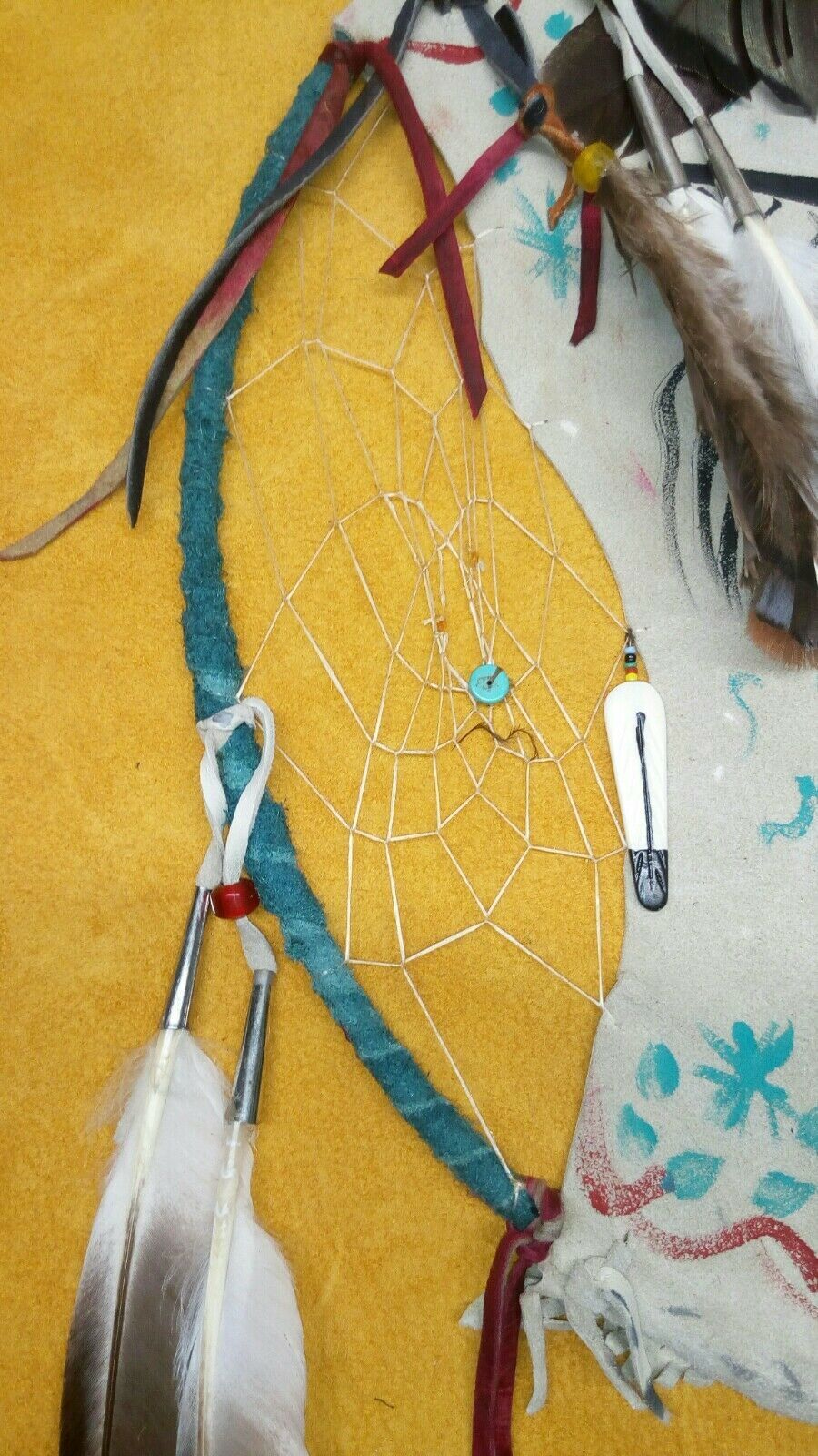native american style mandala .western american black powder powwow. traditional style shield, Thunderbird shield with symbols of water, 2 dreamcatchers woven in, with imatation sinew. made of deer buckskin, wild turkey tail feathers in tin cone, duck feathers in tin cones, With dyed turkey feathers, .each dreamcatchers has a turquoise stone. bone feather, buffalo horn hairpipe with a coyote tooth. red glass crow beads. deer buckskin wrapped around 14 inch brass ring. hand stitched. traditional style