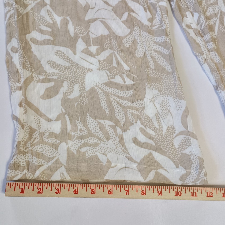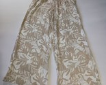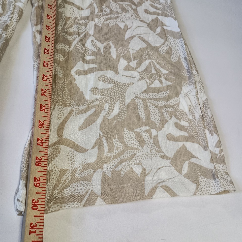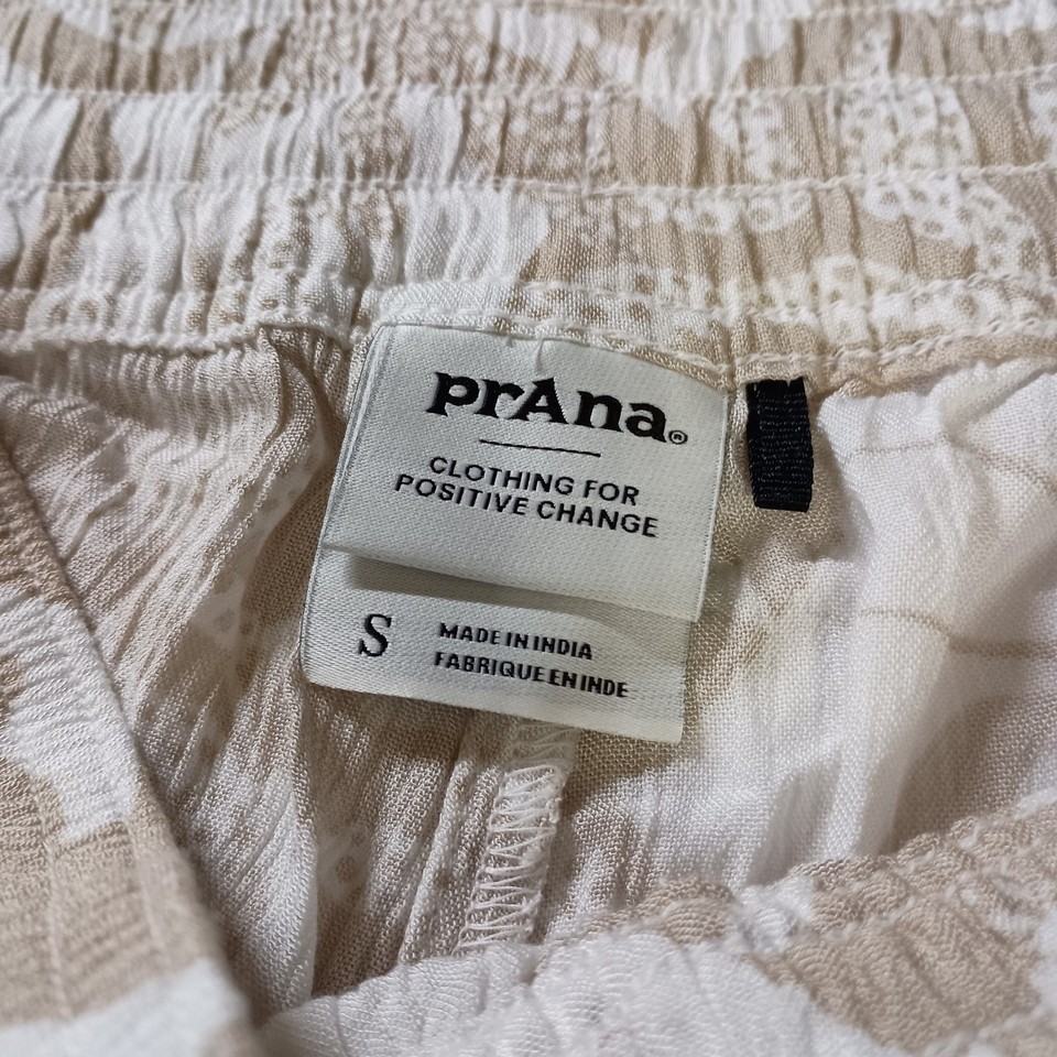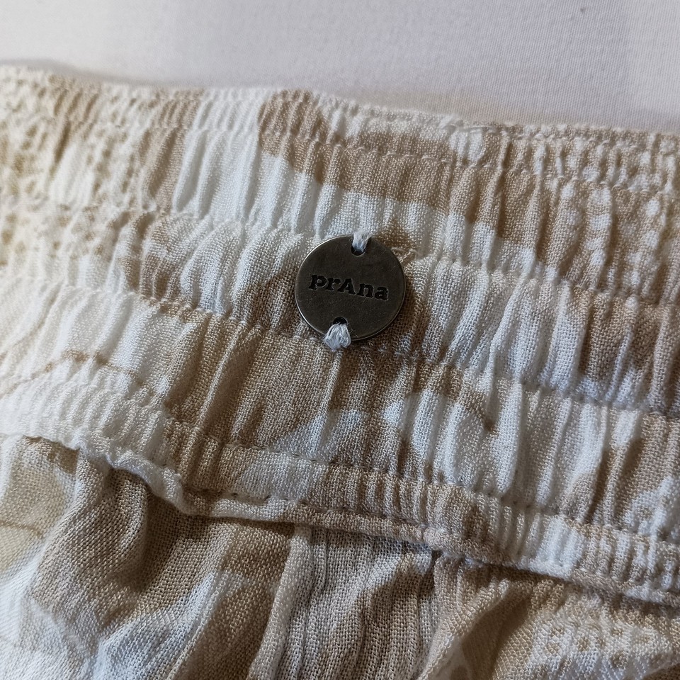 The prAna Women's Beach Pants in size S are designed for a relaxed fit with a wide leg style, making them perfect for casual occasions or parties. The pants feature a soft white and tan color with a boho vibe floral pattern, made from lightweight and comfortable modal fabric. With a drawstring closure and pleated front, these pants offer a stylish and easy-to-wear option for beach days or lounging by the water. The pants also include convenient pockets and a brand logo accent, reflecting a trendy beach theme in their design. Normal wear. Sizes are approximate.
