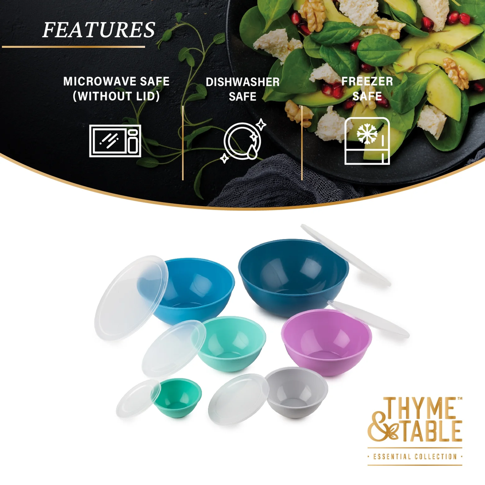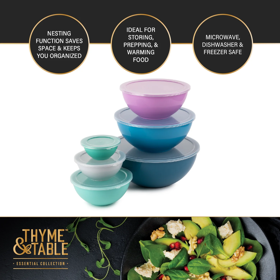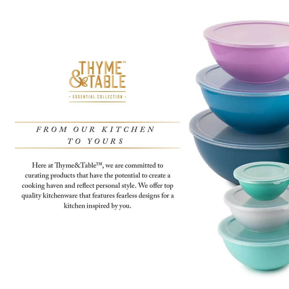 Thyme Table Mixing Bowls, Multi-Color, 12-Piece Set is a part of the Thyme Table Essentials Collection. The mixing bowl set includes six transparent easy grip lids with the six bowls. Bowls nest inside each other for organized, space-saving storage. Microwave, dishwasher, and freezer safe. For care and use, please hand wash in warm water with soap and a soft sponge before first use. Dishwasher, Microwave, and Freezer Safe. BPA Free.