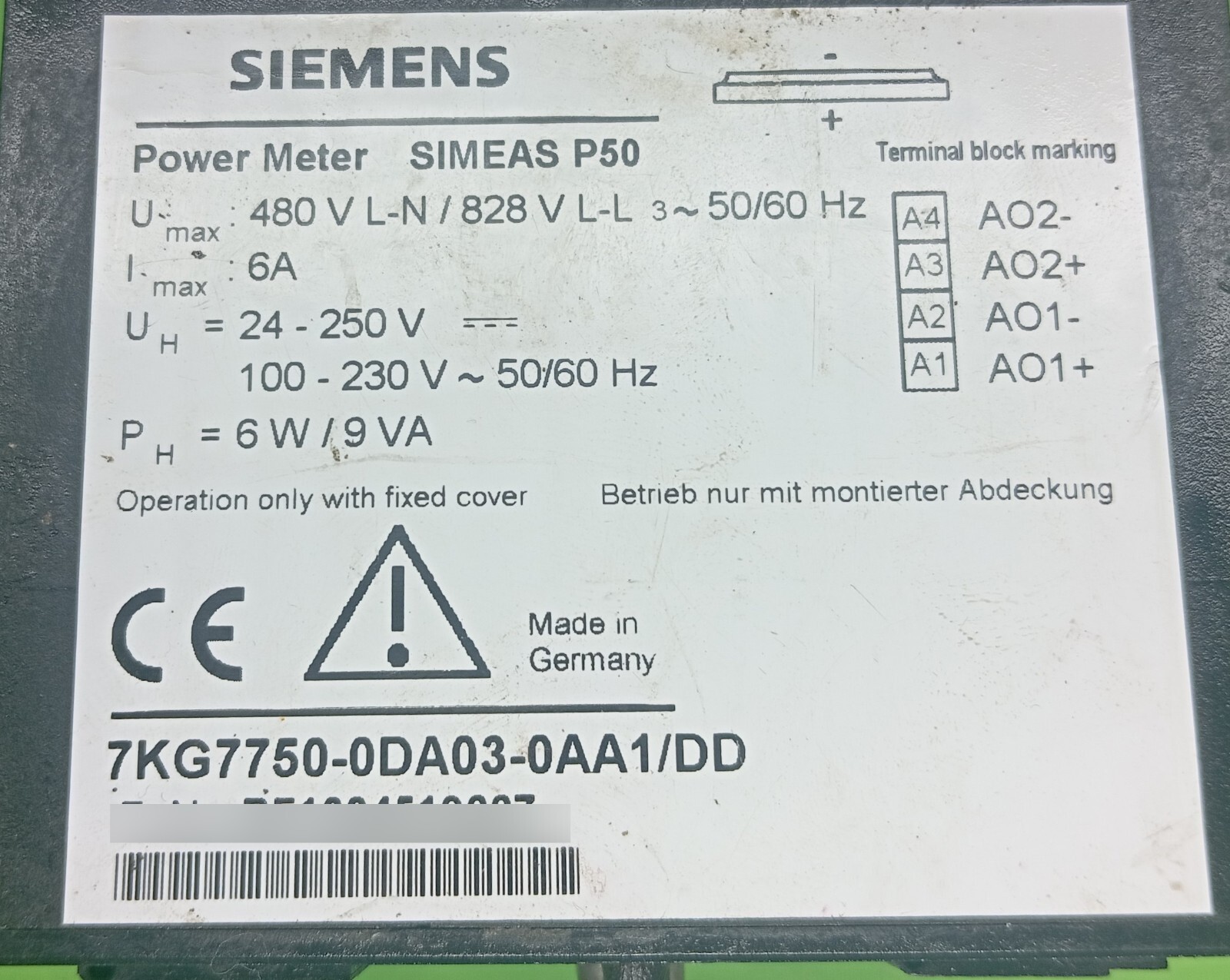 Siemens 7KG7750-0DA03-0AA1/DD is a power meter model from Siemens. It belongs to the SICAM P50/P55 series of power meters. This particular model is a direct-display control panel built-in instrument with a 96 x 96 mm graphic display. It has 2 binary outputs and 2 analog outputs (DC 0-20/4-20 mA). The degree of protection is IP65. It supports communication via RS485 with IEC 60870-5-103 and Modbus RTU/ASCII protocols.