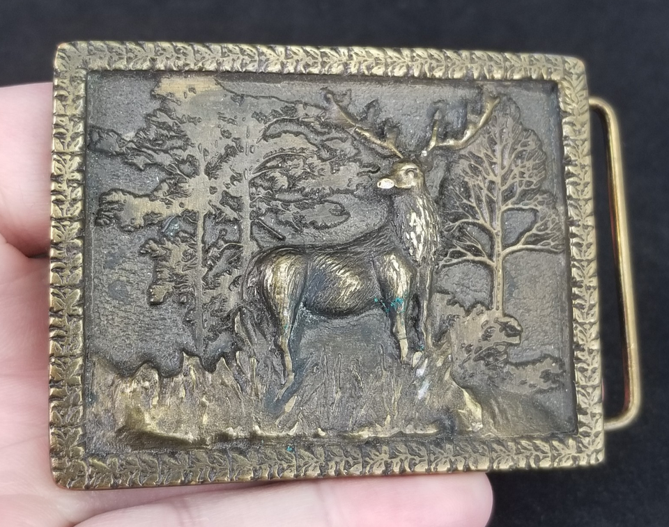 - vintage 1975 Belt Buckle "AJ Dezy" elk FOREST brass USA