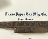 - vintage letter press printing block Texas Paper Box MFG 4 3/4 x 1”