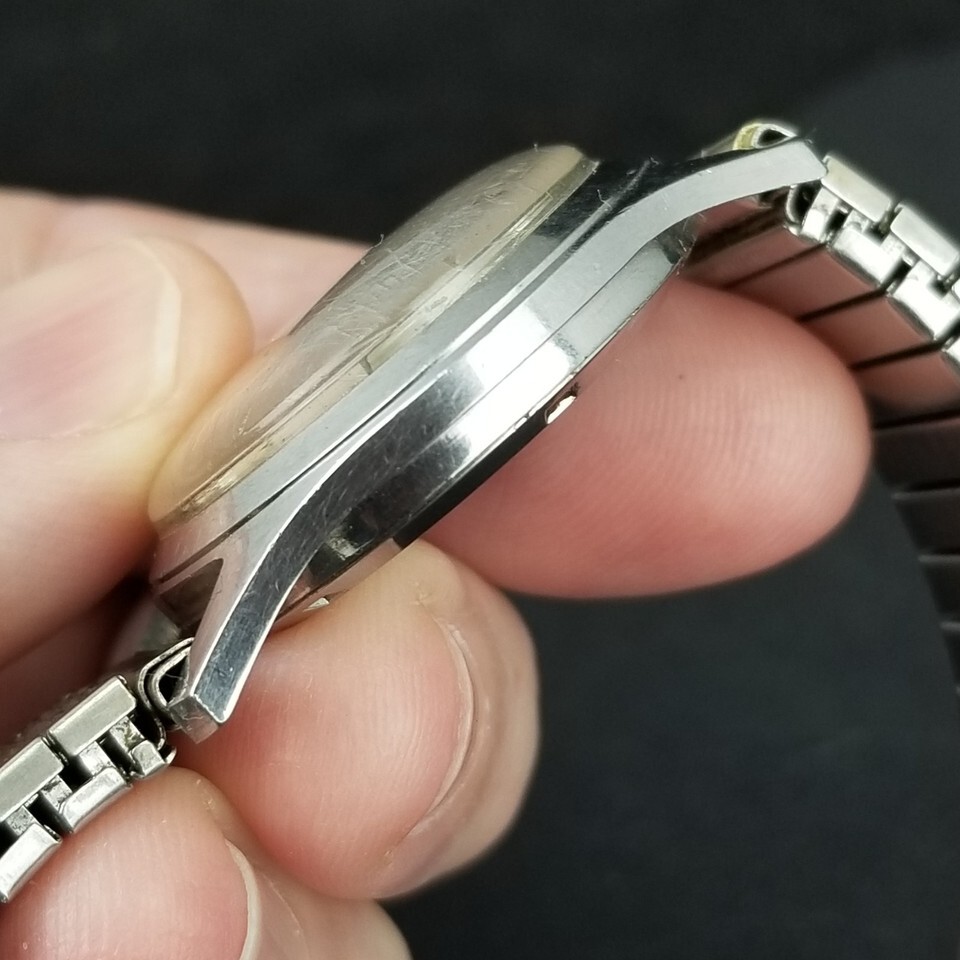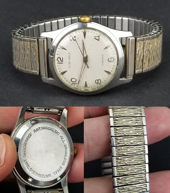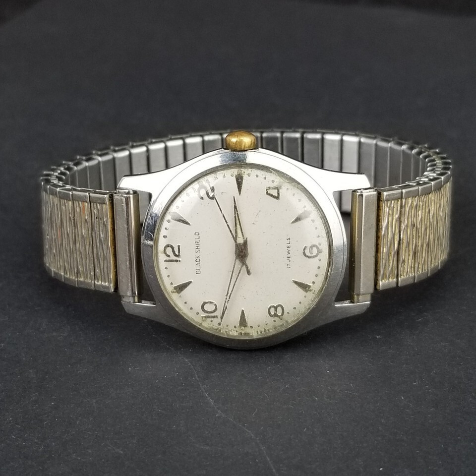 VINTAGE MEN'S WATCH. 30mm wide case not including the crown. "Black Shield" Marked 17 Jewel. All stainless steel watch and band. Condition: Currently running as seen in video. Winds and the time can be set. The band expands as it should. The time can be changed. Some wear as seen in pictures. One very small crack in glass. SEE PICTURES. Location E1, FBMP, MER