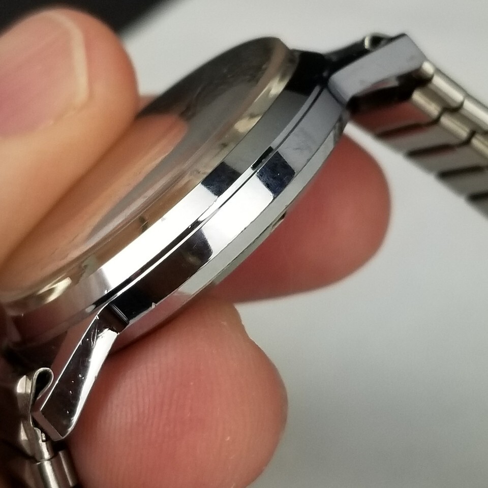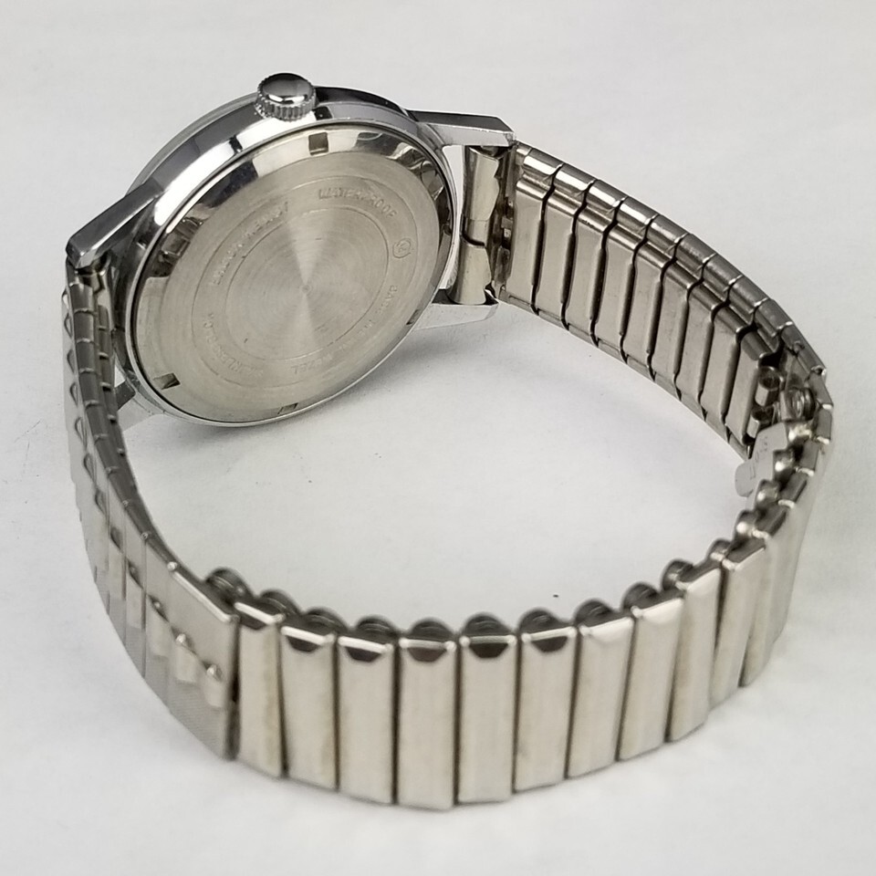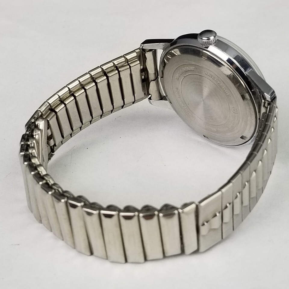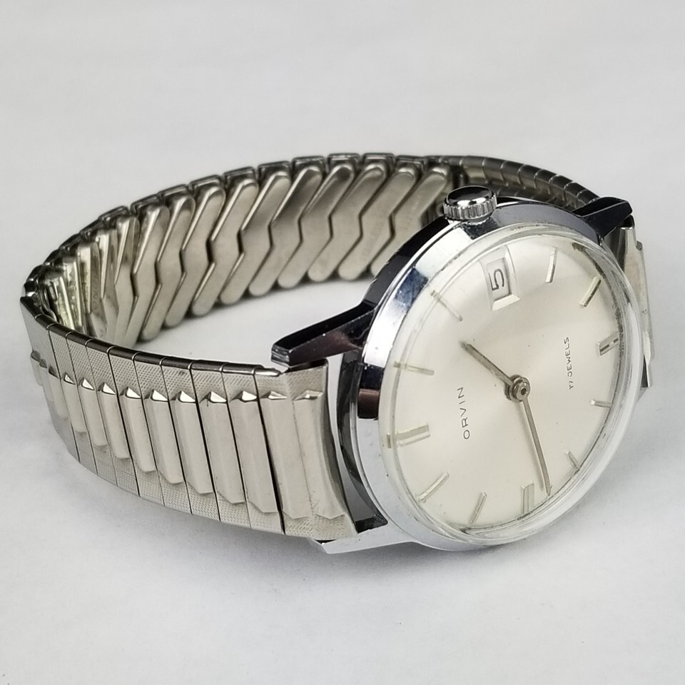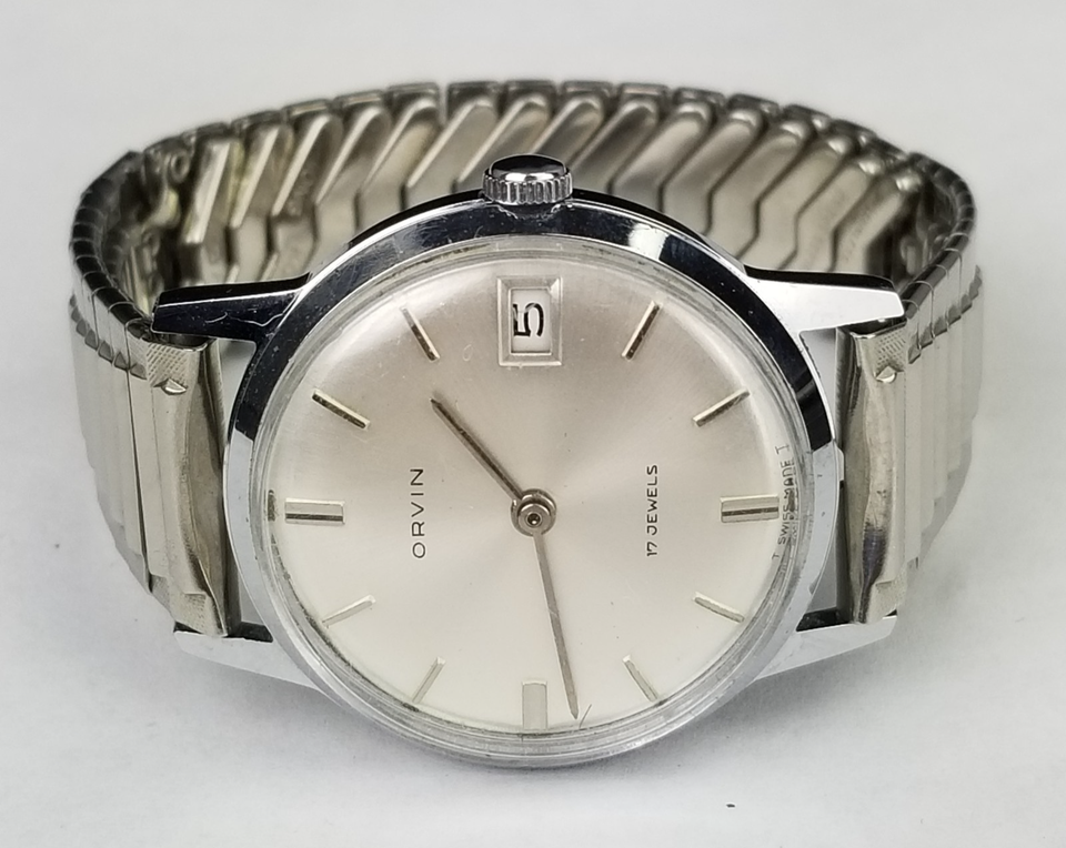 VINTAGE MEN'S WATCH. 33mm wide case not including the crown. "Orvin" Marked 17 Jewel. NICE COSMETIC CONDITION! Condition: Cosmetically, very very little signs of age. Winds and the time can be set. The band expands as it should. A few very light scuffs on the glass is you look very close. Clean. I bumped the watch but cant hear it running. I didnt open the back and oil it. May need some basic maintenance. SEE PICTURES. Location E1, FBMP, MER