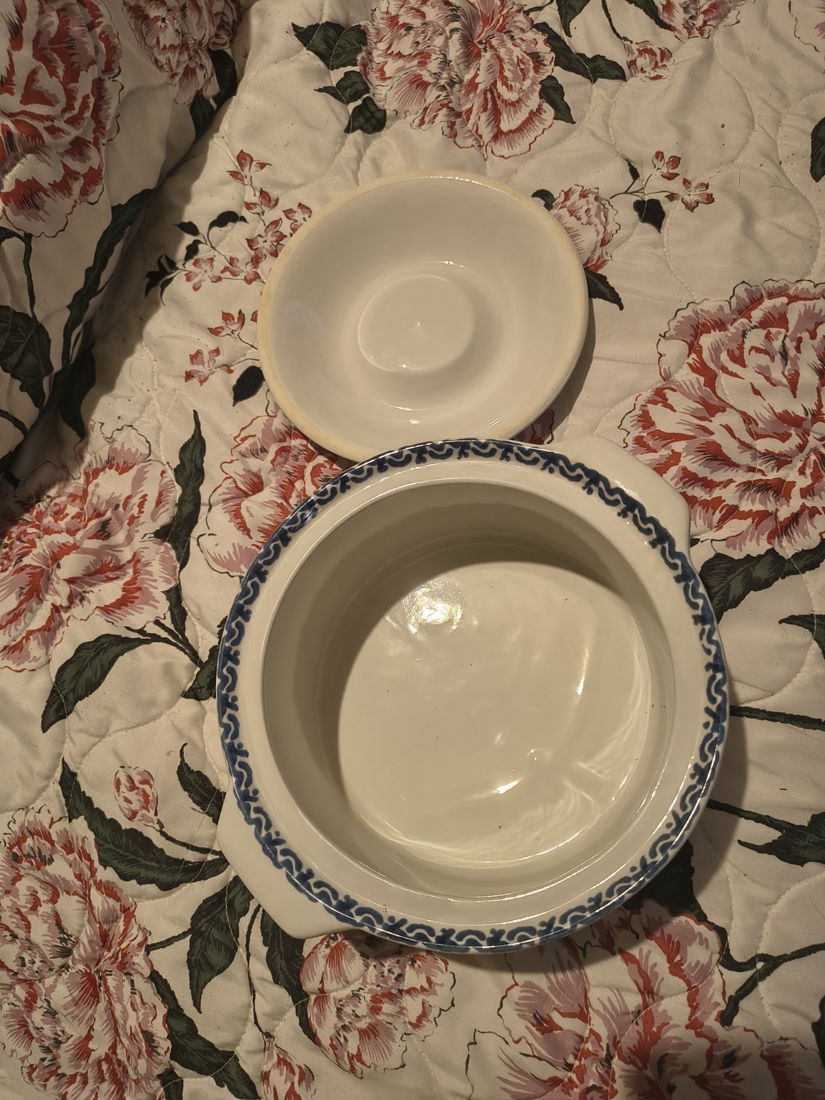 - vtg corelle blue Heart Stoneware crock pot casserolepot with lid blue and white
