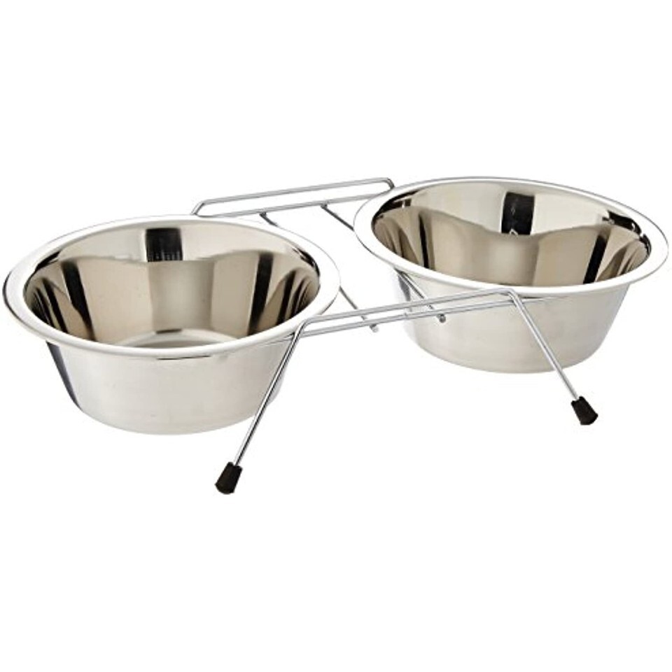 Qt, Stainless Steel Double Diner Raised Pet Bowls, For Food Water is raised to reduce neck strain and to promote digestion. Stainless steel is easy to clean and disinfect.